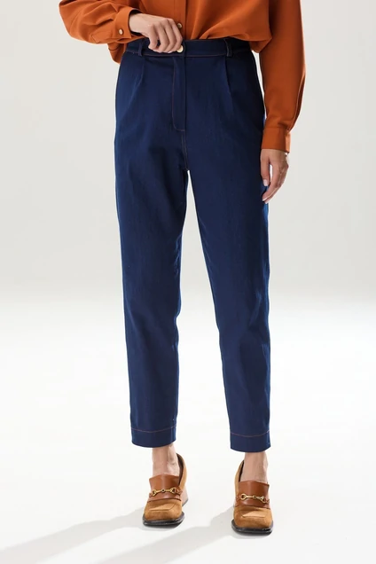 Брюки современного зауженного силуэта. Карманы-хулиганы расположены в боковых швах с наклонным входом. Сзади, на уровне завышенной линии бедра накладные карманы. Спереди фронтальная застежка на клапан-молнию (гульфик) и пуговицу. В пояс талии, по бокам, фрагментарно вставлена эластичная тесьма, шириной 3,5 см. на талии переда, находятся складки-защипы для свободы входа в карман. На задних полотнищах брюк внизу расположена модельная вытачка для уменьшения ширины по низу брюк. Джинсы могут оканчиваться деликатным отворотом. Швы в данных брюках отстрочены декоративной двойной параллельной строчкой, в стиле джинсовой строчки-декора.