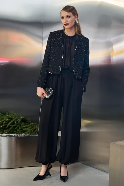 Брюки-алладины свободного кроя. По линии на резинке. По низу брюк также резинка. В боковых швах карманы.