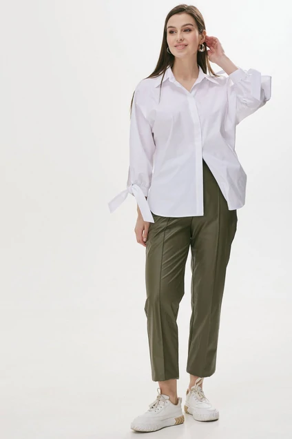 Классические брюки зауженные книзу из экокожи. По верху брюк притачной пояс и шлевки для ремня. Перед и спинка с отрезной кокеткой. На передних половинках брюк наклонные карманы и защипы, на задних – вытачки и накладные карманы. В среднем шве застежка на молнию и пуговицу. В брюки на поясе по спинке вставлена эластичная тесьма (резинка). В комплект входит съемный пояс. Обращаем ваше внимание, что фурнитура может незначительно отличаться от фото.Длина изделия: 99 см + 4.5 см пояс