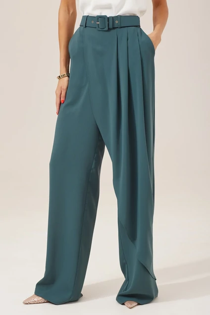 Нарядные брюки прямого силуэта, расширенные книзу. По переду брюк расположена отлетная деталь, с декоративными складками. В боковом шве расположена потайная молния. В 50-54р на спинке в пояс брюк вставлена эластичная тесьма(резинка). В комплект входит съемный ремень. Обращаем ваше внимание, что фурнитура может незначительно отличаться от фото. Длина брюк 114см + 4см пояс