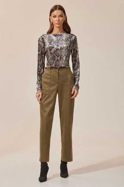 Брюки прямого силуэта, слегка зауженные книзу из замши (имитация замши). По верху брюк притачной пояс с застежкой на петлю и пуговицу и широкие шлевки для ремня, застежка-молния в среднем шве. На передних половинках накладные карманы. Брюки частично на резинке. Ремень в комплект не входит. Длина брюк (44-48р – 97 см+4 см пояс) (50-54р – 98 см+4 см пояс) (56-60р – 99 см +4 см пояс)