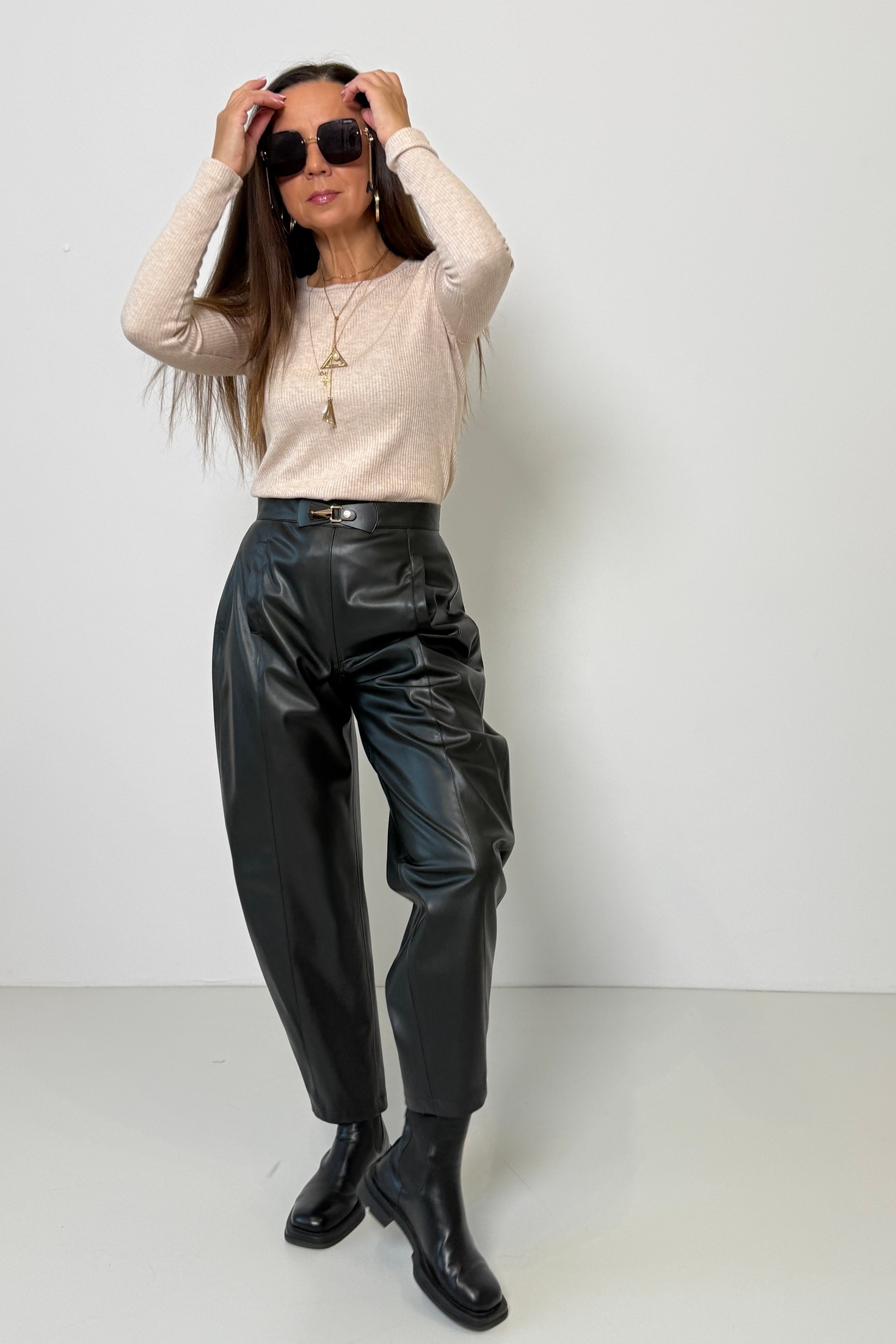 Брюки женские зауженные к низу с рельефами по задним и передним половинкам брюк. В среднем шве задних половинок обработана застежка на тесьму "молния". В релькфах передних половинок брюк обработаны листочки,на поясе украшение из кожи.