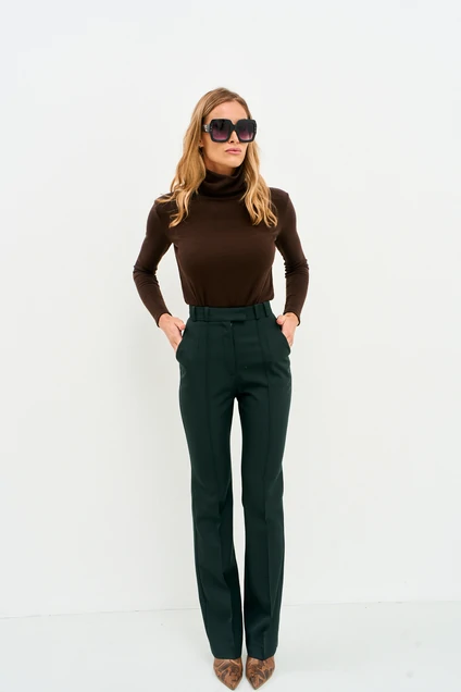 Элегантные женские брюки классического темно-зеленого цвета представляют собой идеальный выбор для стильного делового или повседневного образа. Брюки заужены к низу, что подчеркивает изящество силуэта. Изделие выполнено с высококачественных материалов, обеспечивающих комфорт и удобство при носке. Детали дизайна включают корсажный пояс, который обеспечивает отличную посадку на фигуре. На передних половинках расположены карманы, встроенные в швы, что придает модели утонченный вид. Застроченные канты на передней части создают аккуратный визуальный акцент, усиливающий строгий стиль. Застежка скрытая — на молнию с потайной пуговицей и брючным крючком, что добавляет практичности. Шлевки для ремня по поясу позволяют использовать аксессуары для создания индивидуального образа. Задние половинки с вытачками и аккуратно заутюженными кантами оптимально формируют фигуру. Длина изделия составляет 110 см, позволяя идеально сочетаться как с каблуками, так и с более низкой обувью. Для этой модели доступны различные размеры: обхват талии varьируется от 66 до 90 см, а обхват бедер — от 92 до 116 см, позволяя подобрать идеальный размер для каждой фигуры.