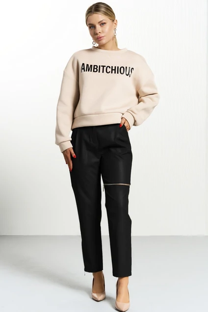 Брюки из эко-кожи свободного кроя со складками и карманами по переду. Пояс притачной со шлевками. Низ на подгибке. Застёжка центральная на гульфик и молнию. На правой брючине в низу в боковом шве — молния, на левой — выше колена декоративный разрез и действующая молния!