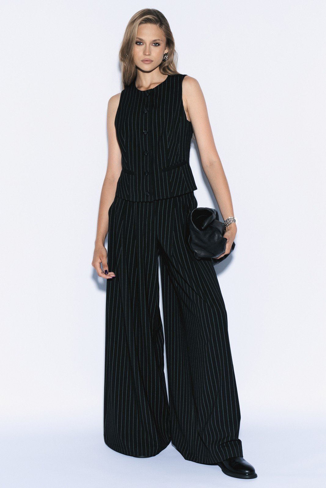 Брюки-палаццо со складками от пояса, карман в боковых швах, на поясе застёжка-крючок и брючная молния.