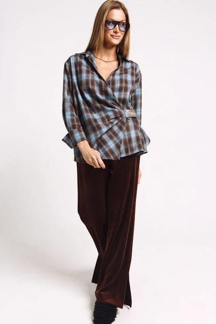 ​​​​​​​Брюки бархатные, глубокого коричневого цвета. Ворс среднего размера. Карманы в боковых швах. Средняя посадка. Пояс на резинке. По низу брюк - разрез по внешнему шву.