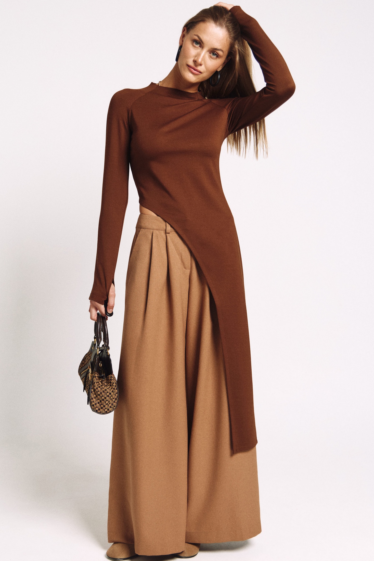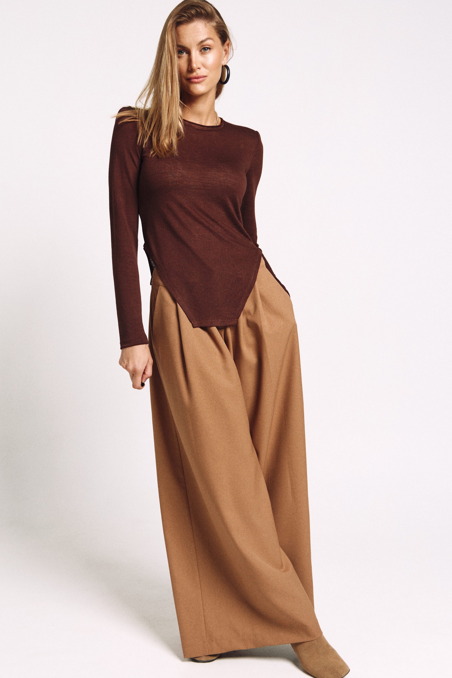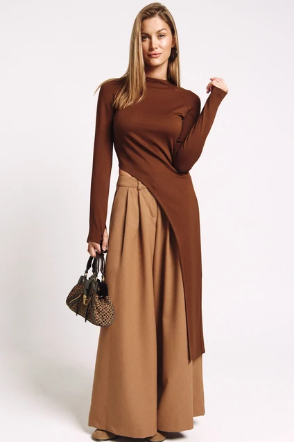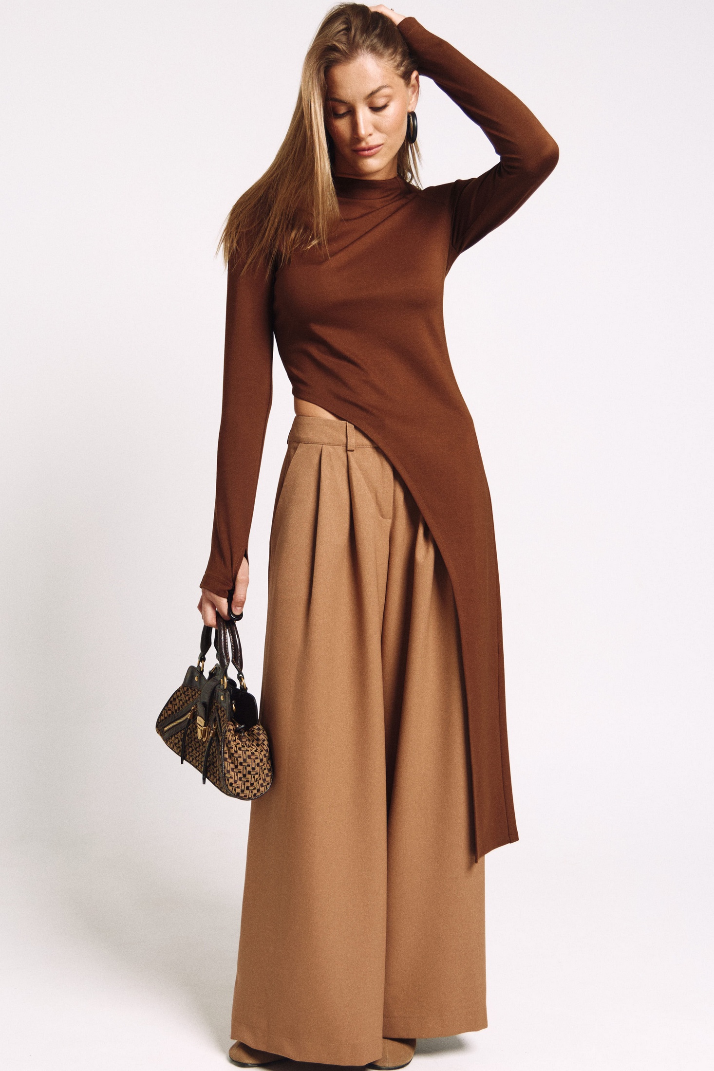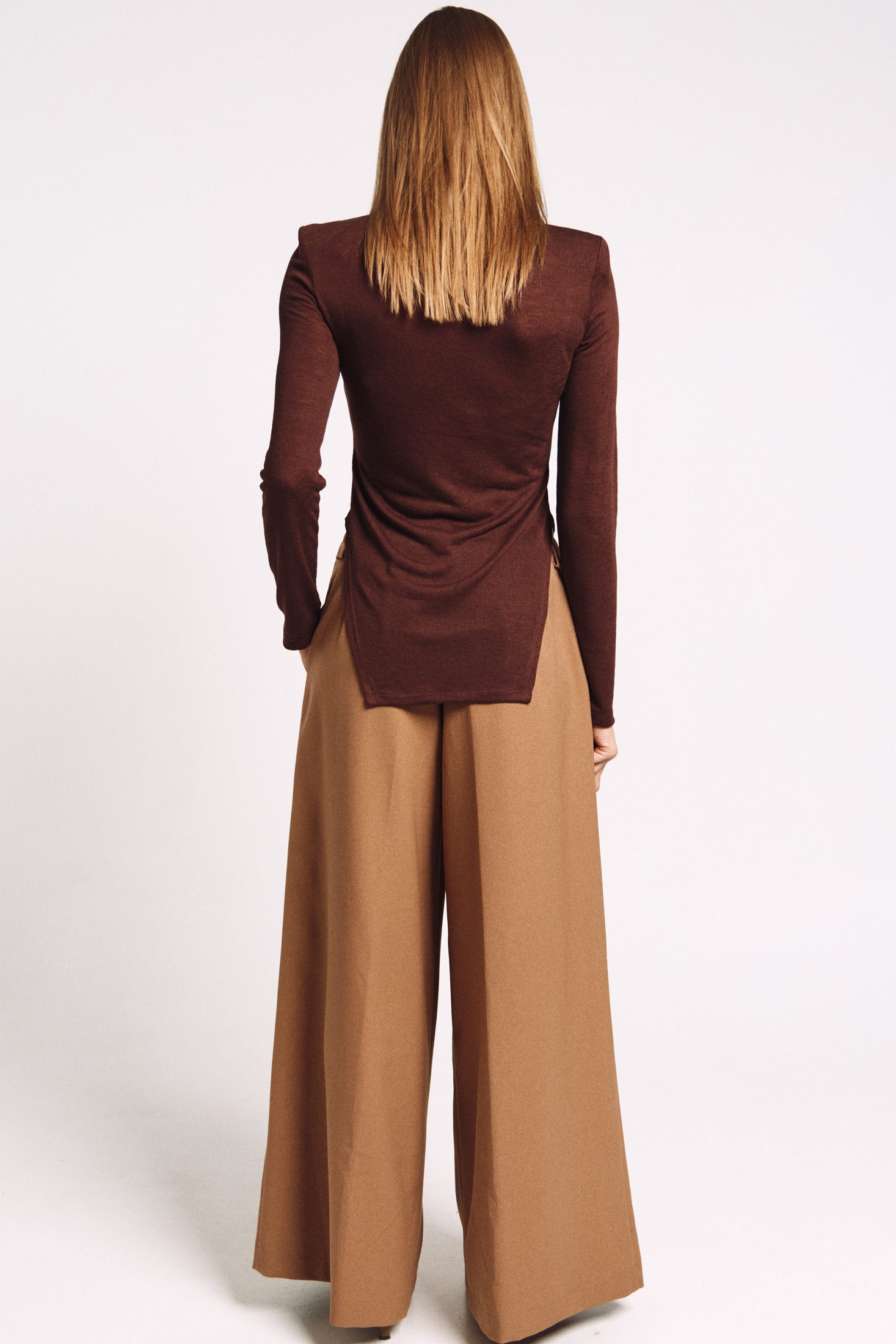Брюки-палаццо в цвете "охра". Две складки по переду.Карманы в боковых швах. Средняя посадка по талии.