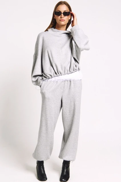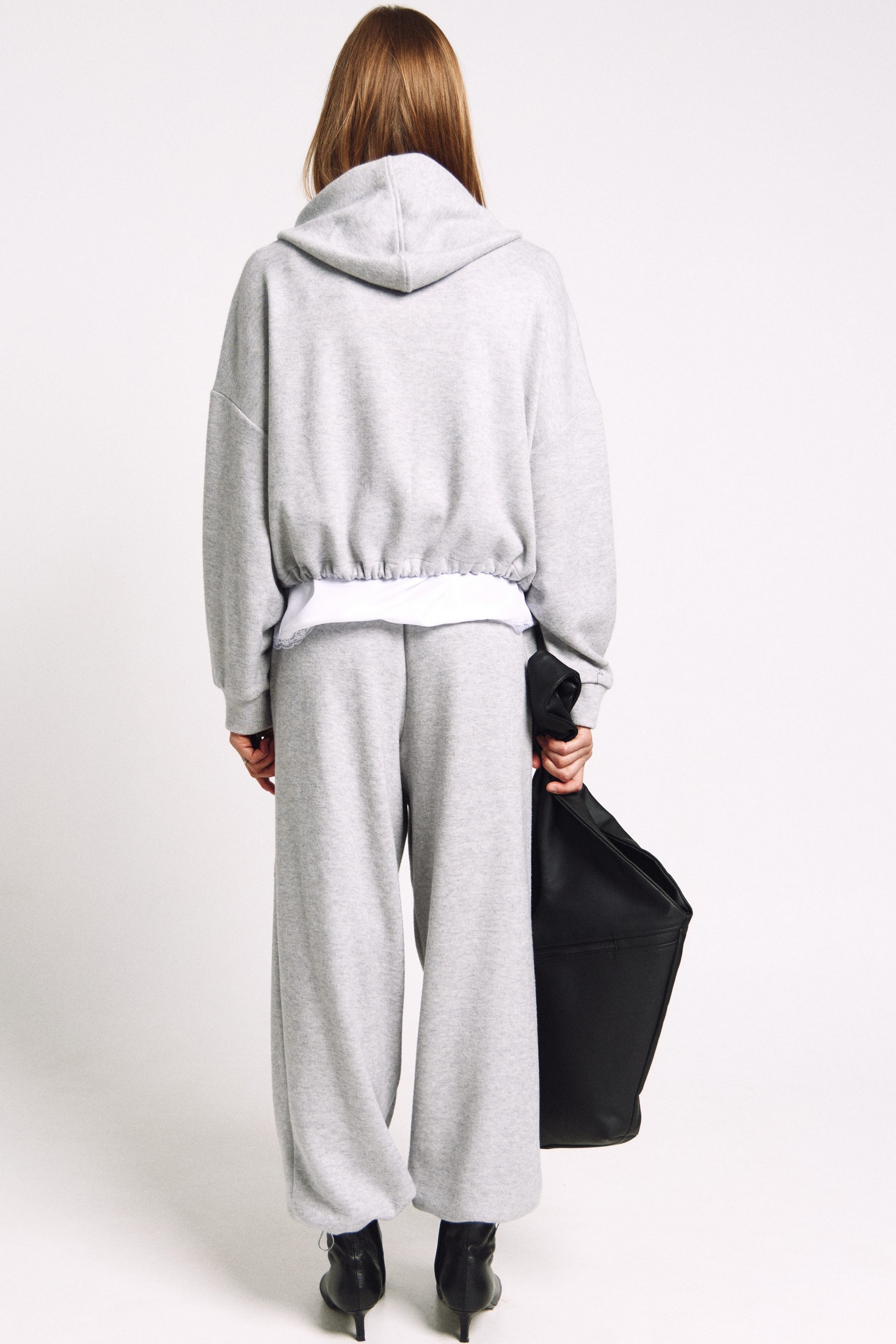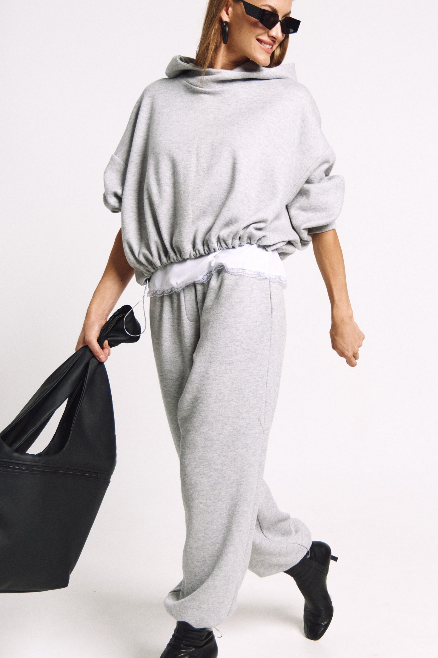 Джоггеры из мягкого трикотажа, в классическом сером. Джоггеры умеренного объема. По низу ширина регулируется металлизированной резинкой и фиксаторами.