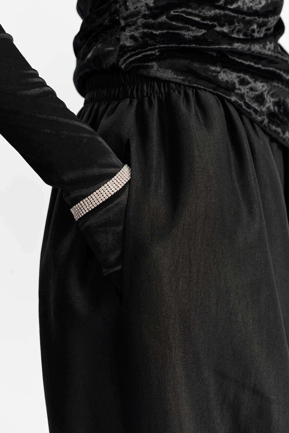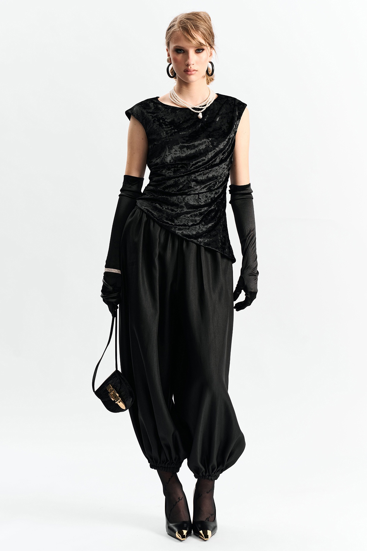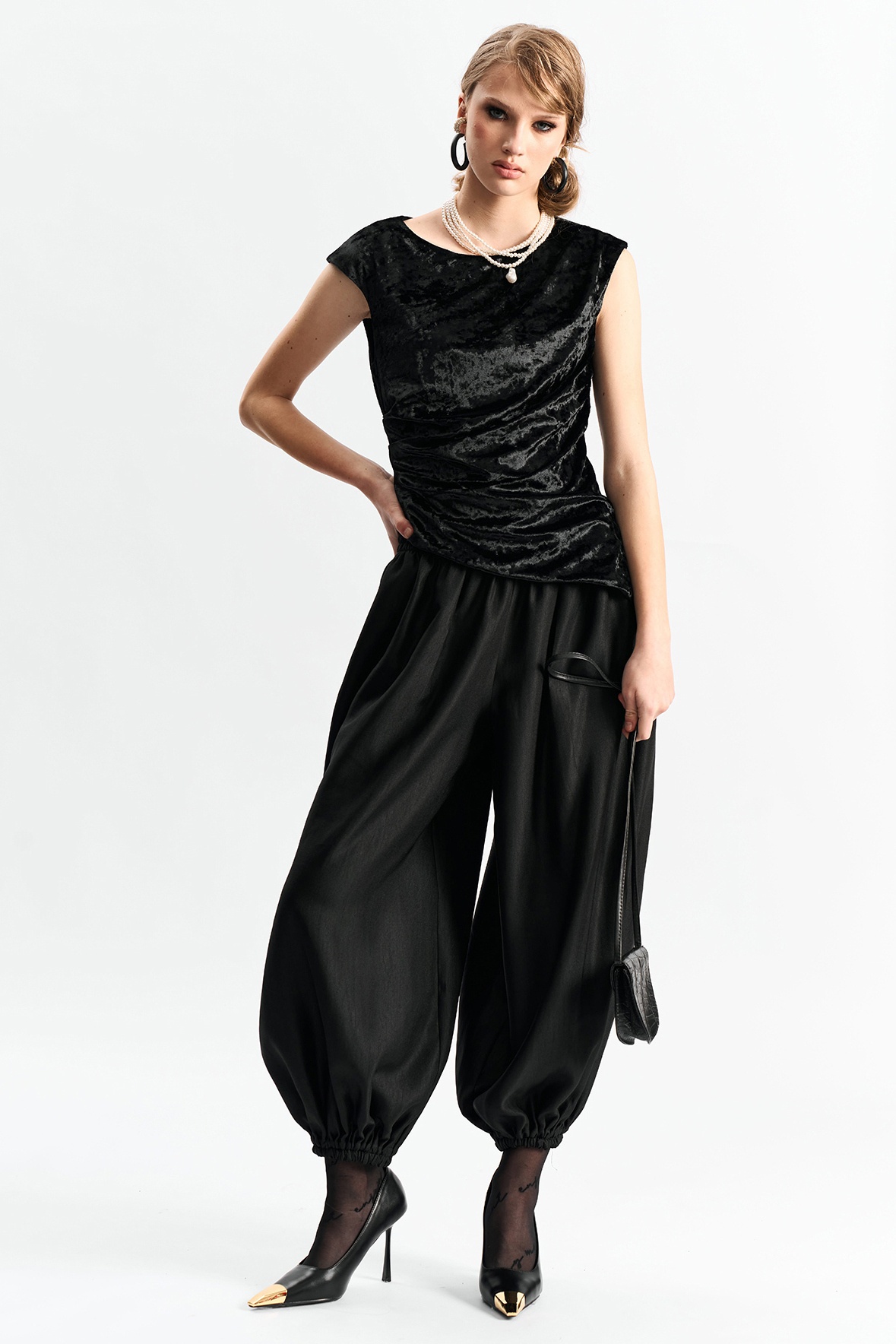 Стильные и ультрамодные брюки-"алладины" в черном цвете, изготовленные из высококачественной смесовой вискозы с изящным блеском. Этот эксклюзивный дизайн отличается эластичным поясом и низом на резинке, обеспечивая идеальную посадку и комфорт. Брюки идеально подходят для создания как повседневных, так и вечерних образов, благодаря своему универсальному и актуальному крою этого сезона. Доступны в двух размерах: S (соответствует 42-44-46) и L (48-50-52), что позволяет каждой женщине найти идеальный вариант для себя.