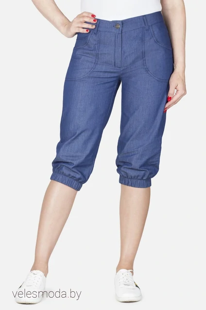 Ткань: Джинс Практичные, удобные Капри из лёгкой джинсовой ткани,свободные по ногам. Низ обработан резинкой. Спереди - 2 накладных кармана. Сзади – 2 накладных кармана. Застёгиваются на молнию. В задней части пояса вставлена резинка. Таблицу измерений изделия смотрите на фото 5. Посадка : Р-ры 48 -средняя Р-ры 50-58- высокая.