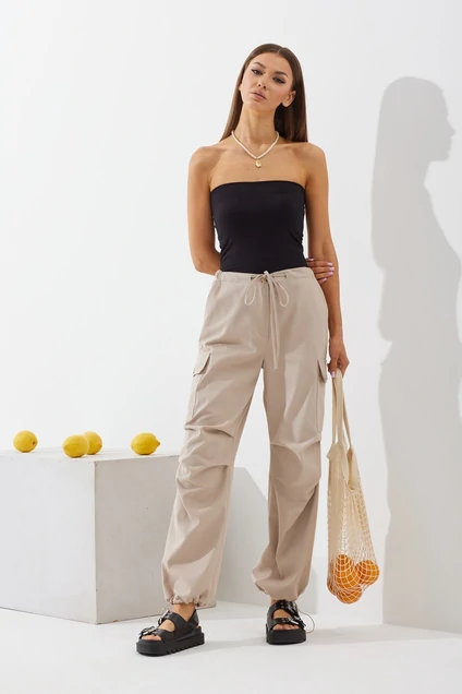 Верхний срез брюк застрочен в подгибку с закрытым срезом создавая кулису, от кармана в задней части брюк вставлена резинка, впереди вставлен шнур. В боковых швах наклонные карманы. Застежка на тесьму-молнию «гульфик». На боковых швах настрочены накладные карманы с клапаном. В области колена на детали переда заложены параллельные складки направленные вниз. По низу брюк кулиса с резинкой и фиксаторами. На правой задней половинке настрочен накладной карман с клапаном.