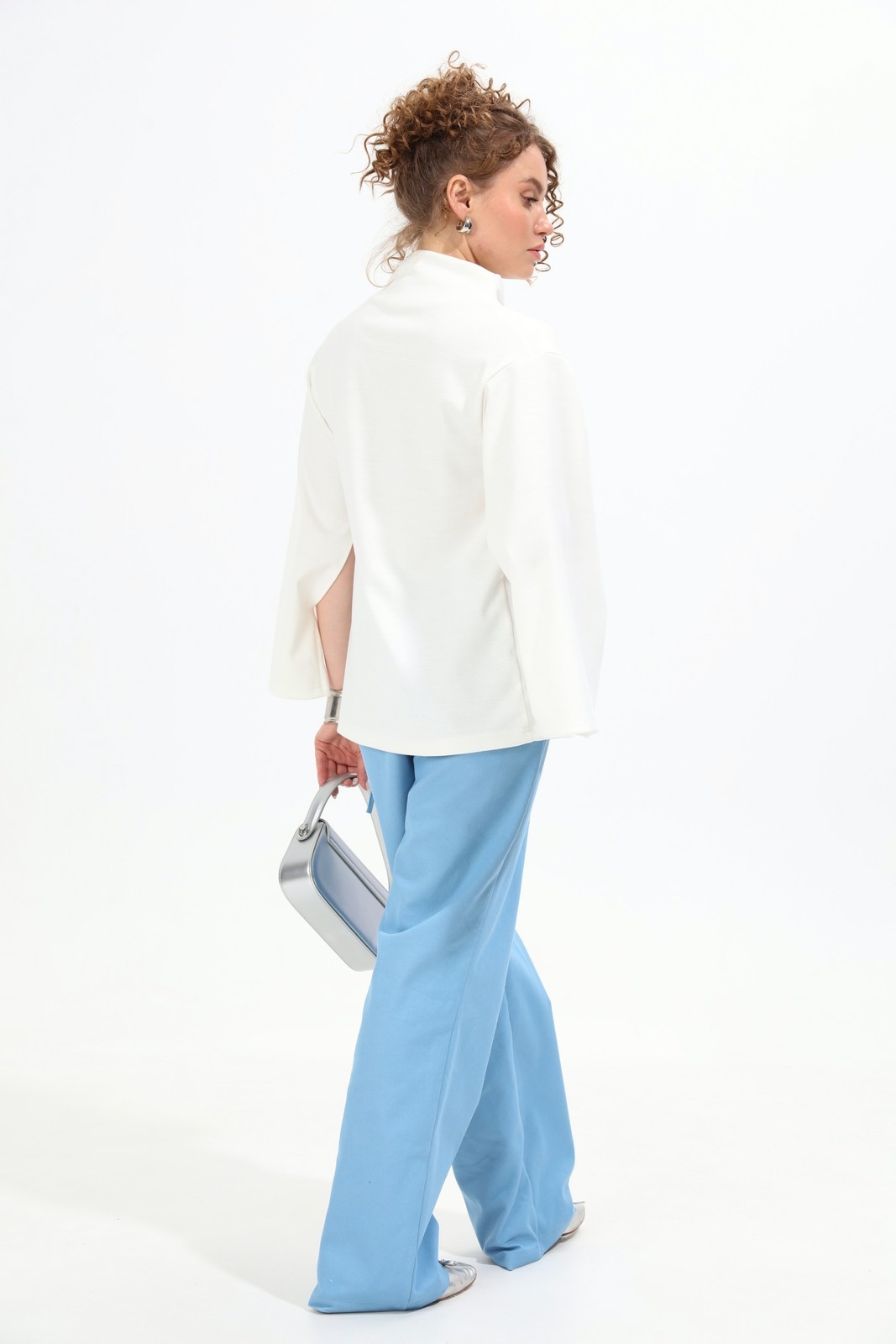 Прямые брюки с двойным поясом из отделочной контрастной ткани. Изделие по линии талии на резинке с имитацией гульфика. Карманы с отрезным бочком.