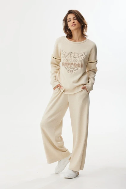 Брюки средней посадки из мягкого трикотажа. В пояс вставлена резинка с регулируемым шнурком. В боковых швах карманы.