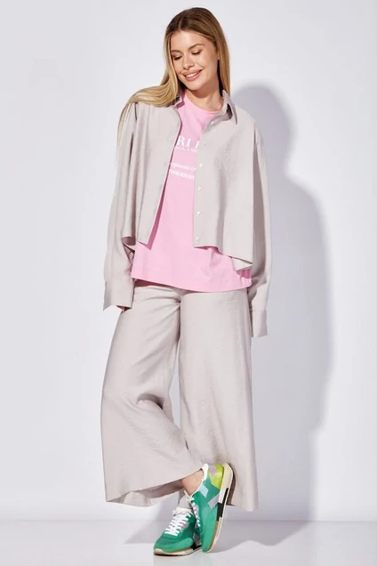 Брюки женские расширенные к низу длиной до щиколотки. Изготовлены из ткани с высоким содержанием вискозы и с эффектом "креш". Посадка брюк на талии. Верхний край обработан широкой окантовкой, застежка в боковом шве на потайную молнию. Спереди обработаны боковые вертикальные прорезные карманы с листачкой.