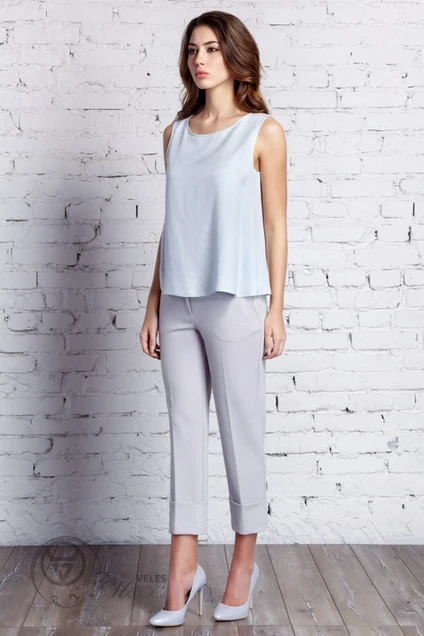 Брюки из плотного трикотажа классического силуэта, слегка зауженные к низу, с высокими манжетами. Застежка на поясе на потайную пуговицу и крючок.