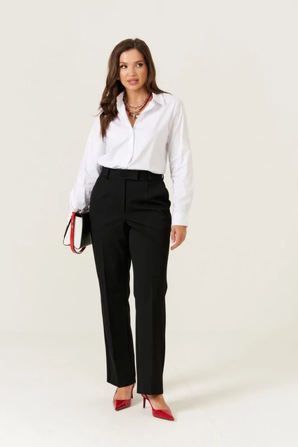 Женские брюки из поливискозной ткани чёрного цвета предназначены для повседневной носки. Верхний срез брюк обработан притачным поясом с застежкой на крючок и молнию в среднем шве. По поясу расположены шлевки для ремня. Передняя часть украшена двумя талиевыми вытачками, обеспечивающими хорошую посадку. Задняя часть также имеет две талиевые вытачки и два кармана с листочкой для удобства. В боковом шве расположены карманы с подкройным бочком, что добавляет функциональности и аккуратности внешнему виду. Брюки выполнены из мягкой и приятной на ощупь ткани, легко сочетаются с различными топами и обувью, создавая стильный повседневный образ.