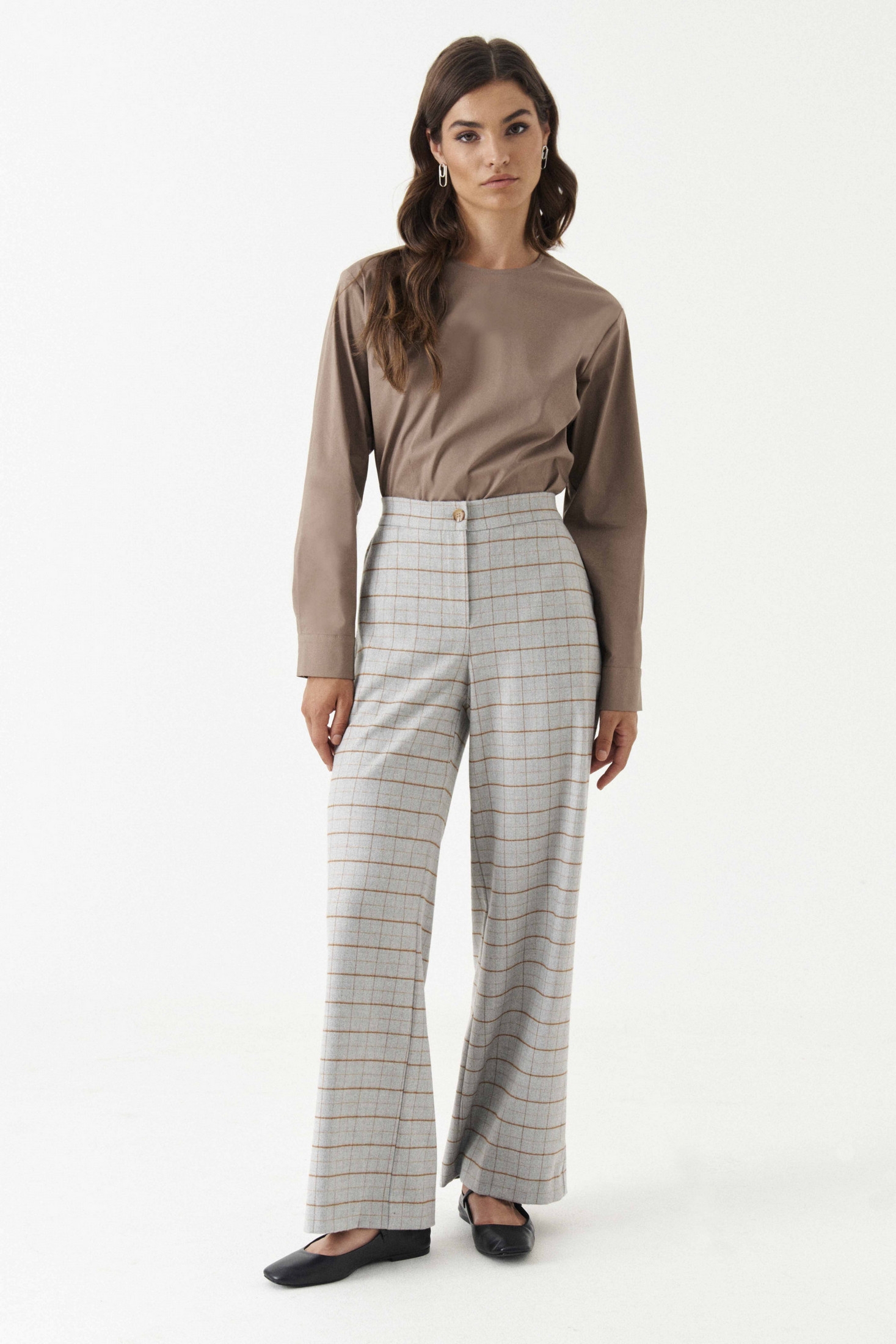 Брюки женские прямые из смесовой ткани в клетку для повседневной носки. Верхний срез брюк обработан притачным поясом, по задней части брюк присутствует пояс с вставкой на резинке. Застежка на одну петлю и одну пуговицу, а также имеется застежка на тесьму-молнию в среднем шве брюк. В брюках расположен в боковом шве карман с подкройным бочком. Отличный классический вариант брюк, которые будут гармонично смотреться под любые изделия.