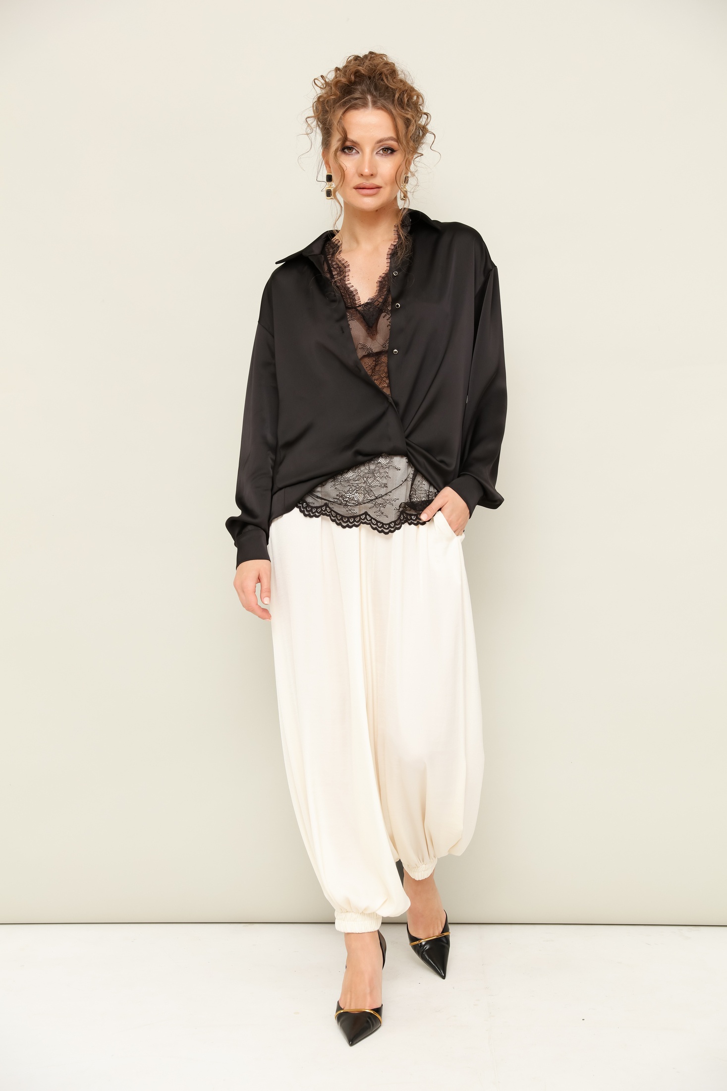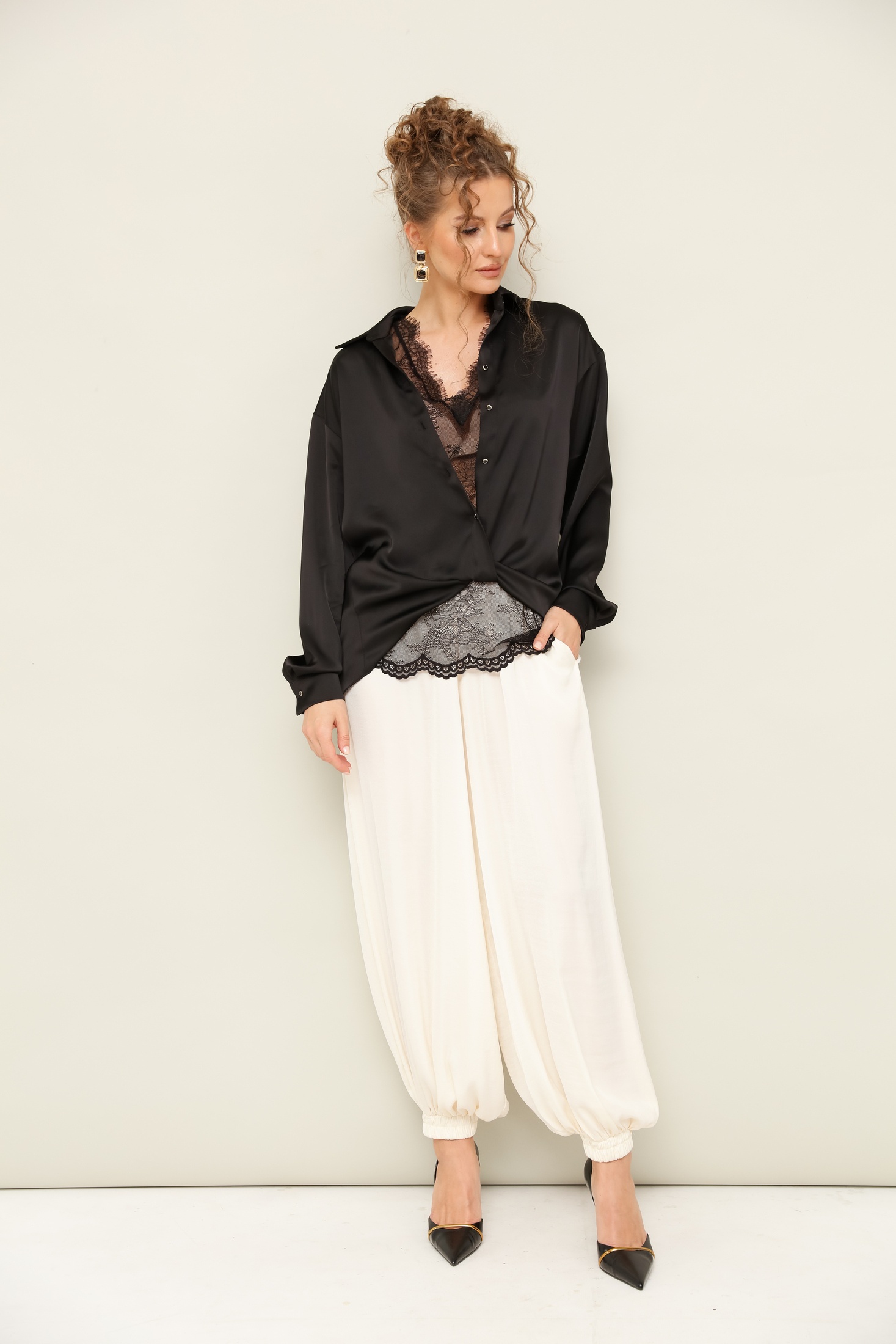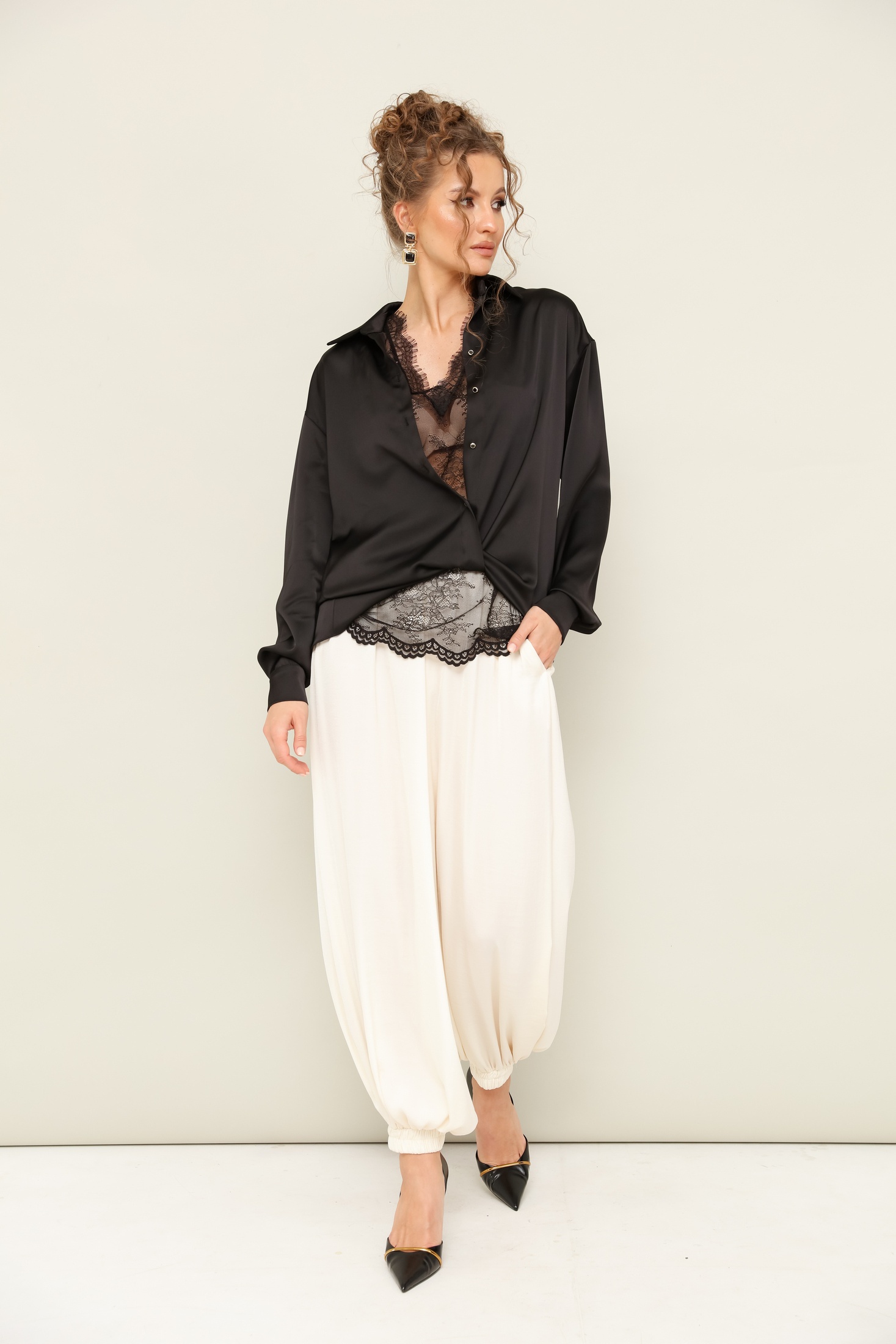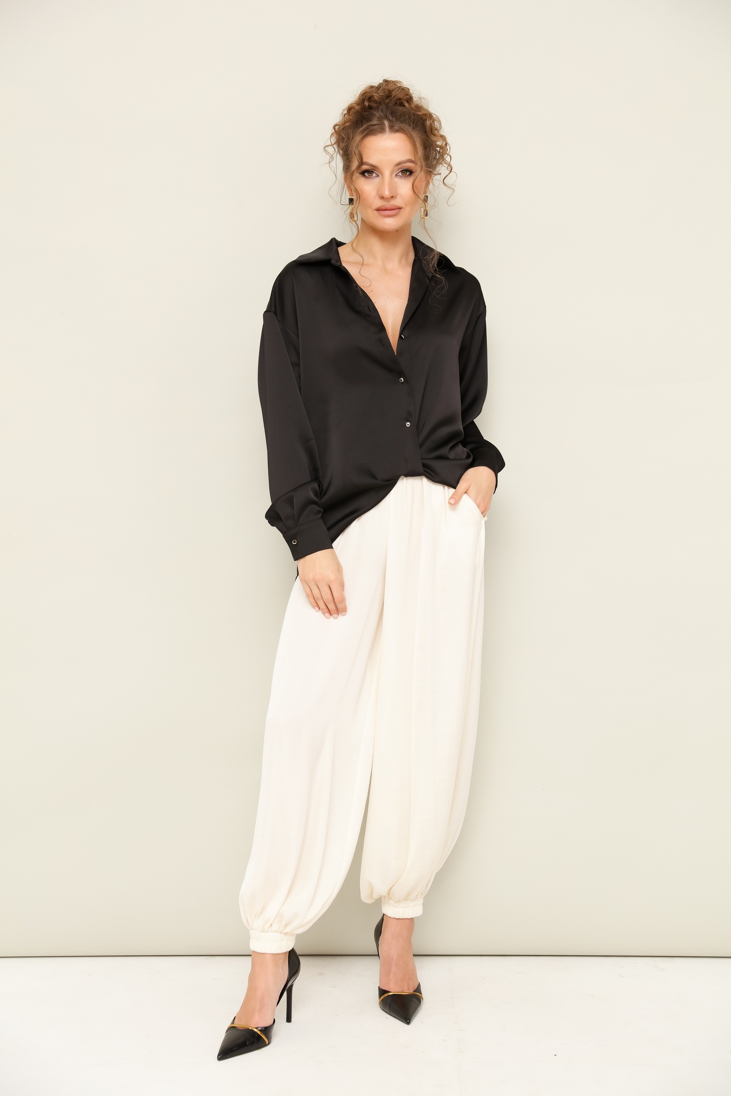 Брюки алладины, выполнен из струящейся ткани с матовым блеском. Брюки свободного силуэта с боковыми наклонными карманами. Притачной пояс и манжеты на резинке.