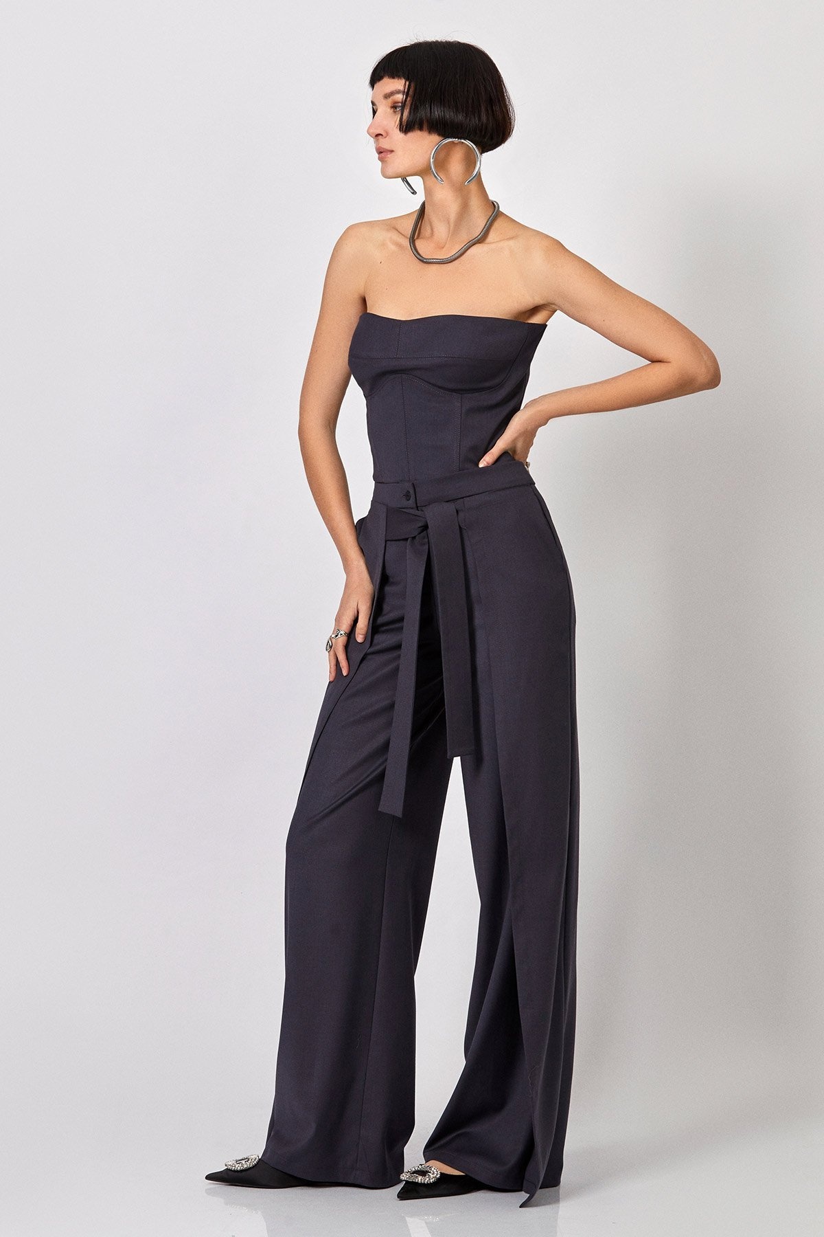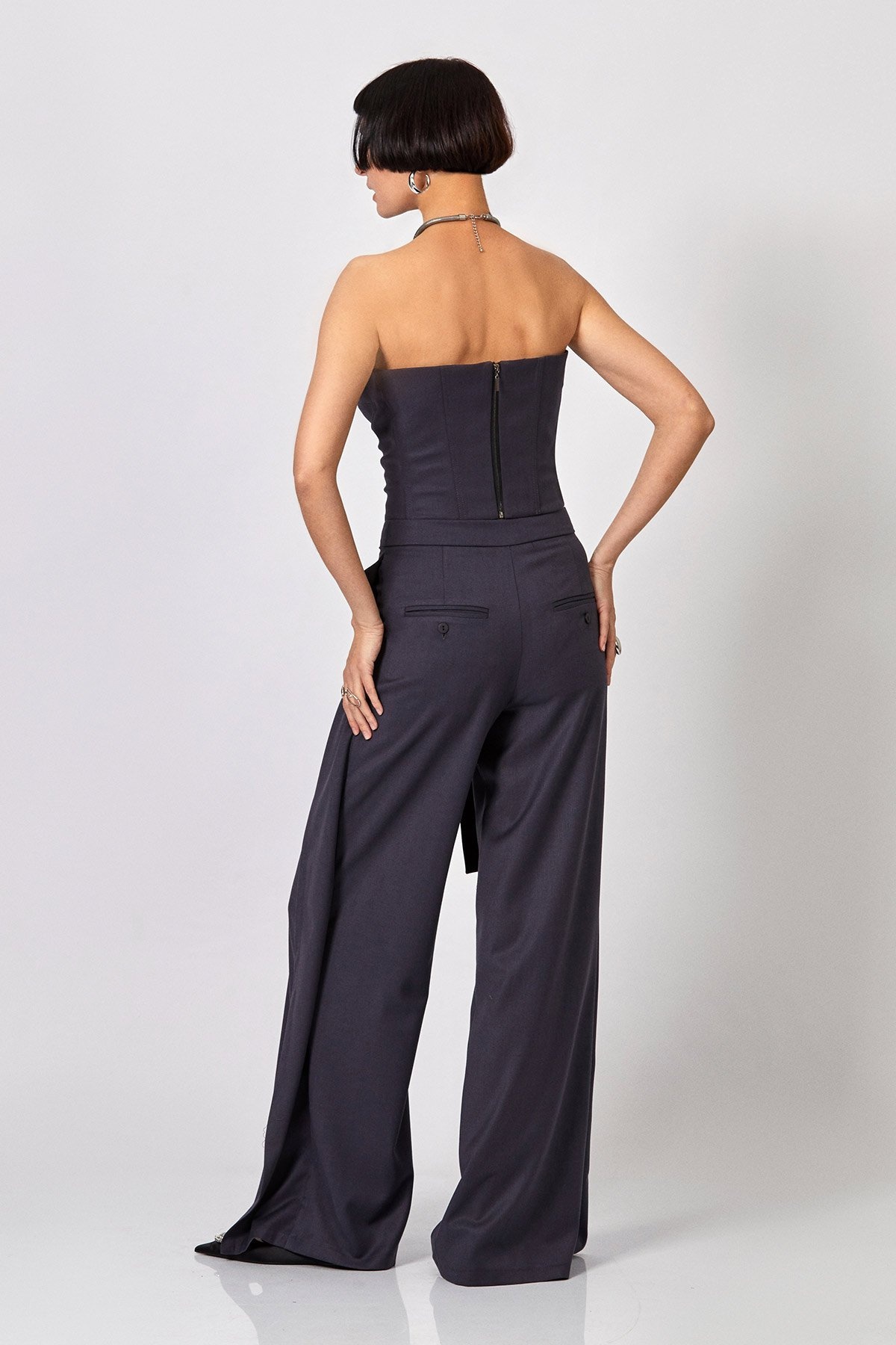 - боковые детали брюк вверху соединены с декоративным поясом