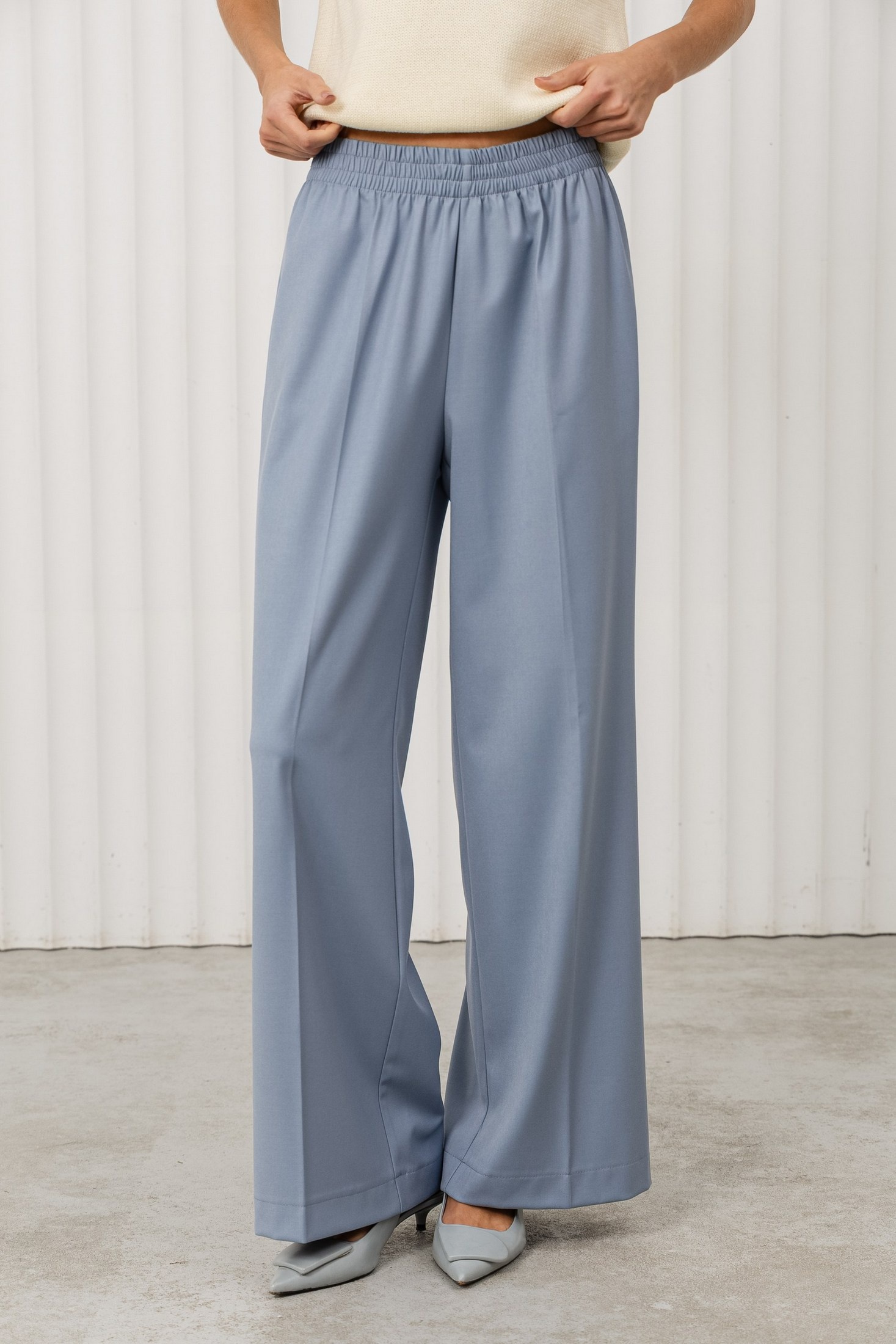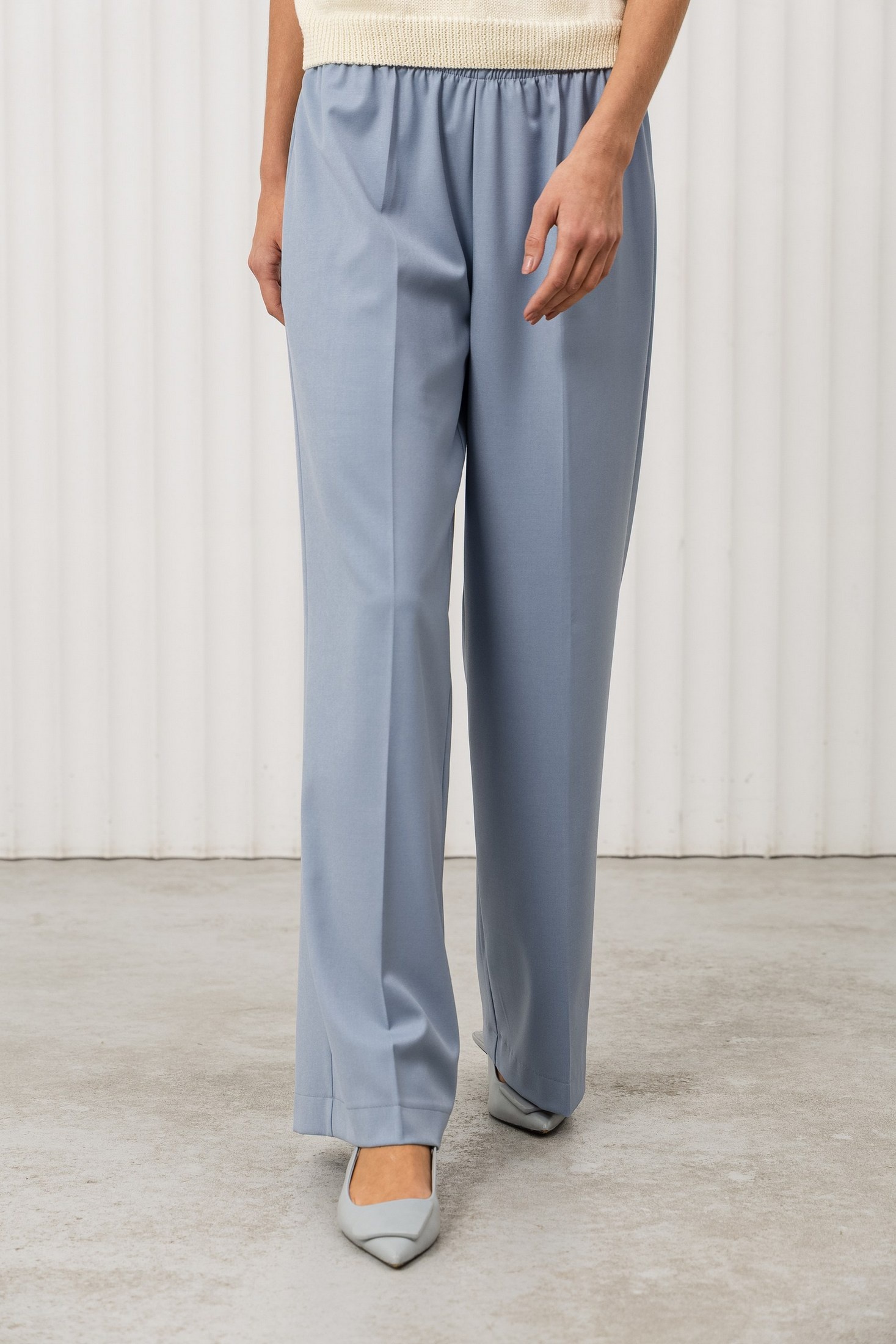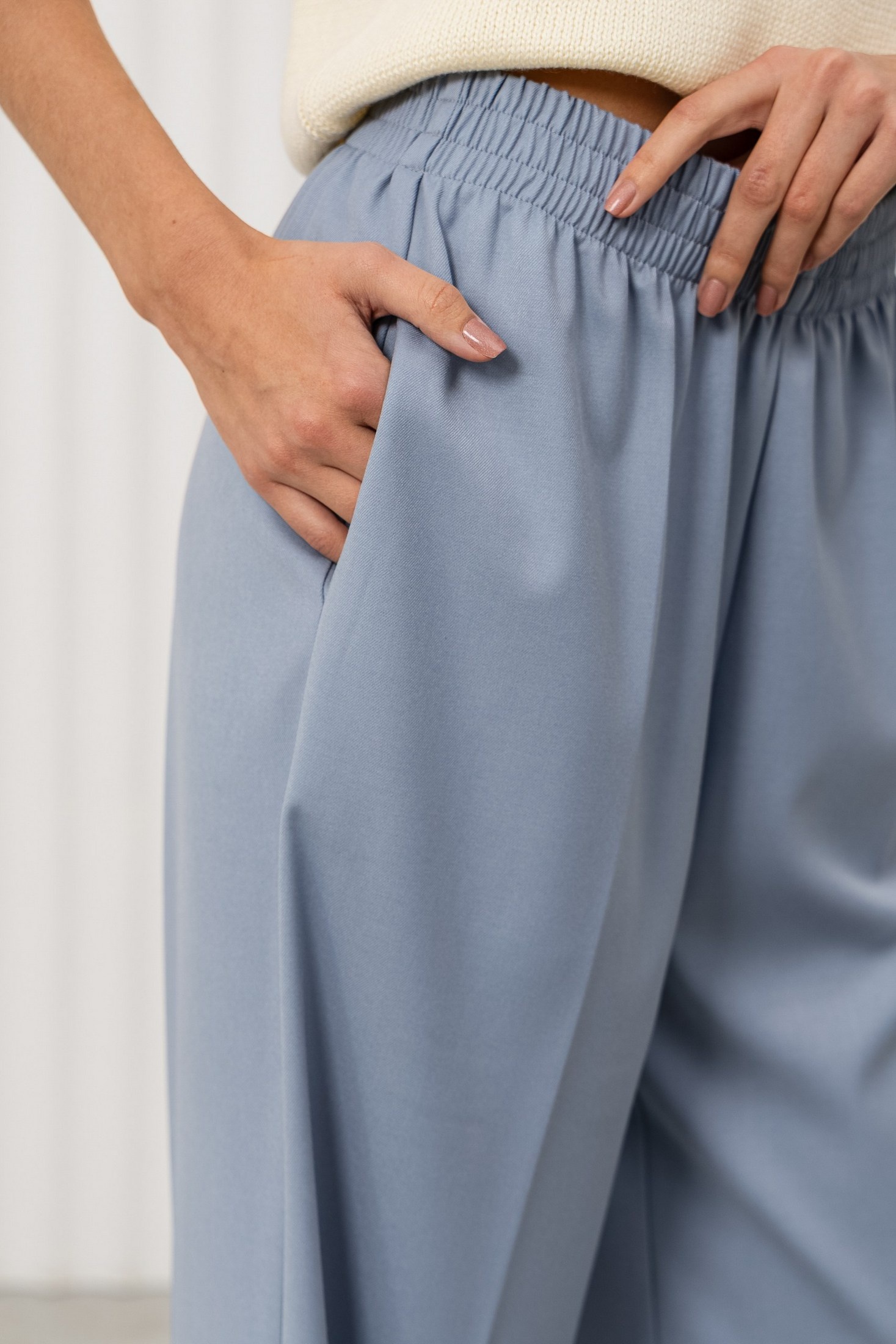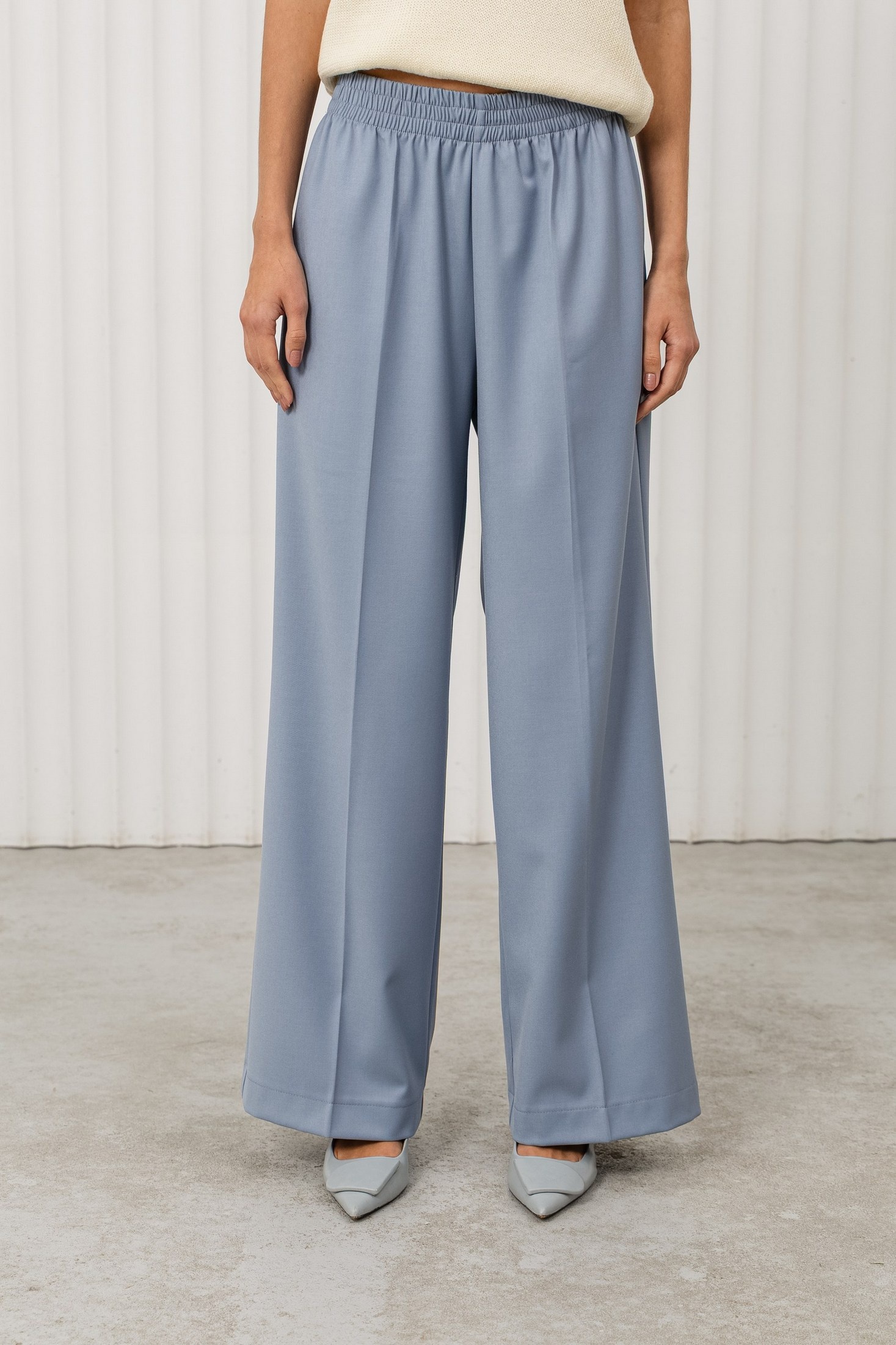 Дизайн: брюки свободного кроя с высокой посадкой и резинкой на поясе, что делает их удобными и практичными. Гладкая ткань и классический крой подчеркивают стиль и элегантность;