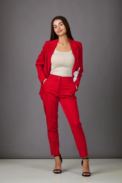 Элегантные женские брюки красного цвета из высококачественной костюмной ткани. Они подчеркивают изысканный вкус и стиль. Эта модель имеет среднюю посадку и слегка зауженный к низу крой, который идеально подчеркивает силуэт. Брюки оборудованы наклонными карманами для добавления практичности, а регулируемый эластичный пояс обеспечивает отличную посадку на фигуре. Застежка на молнию впереди и одна пуговица дополняют утонченный дизайн. Этот модный элемент гардероба идеально подойдет для деловых встреч или элегантных мероприятий, добавляя яркости и уверенности в каждый образ.