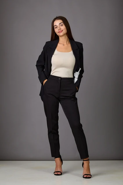 Элегантные женские брюки тёмно-серого цвета, выполненные из качественной костюмной ткани. Модель средней посадки идеально подчеркивает силуэт, благодаря слегка зауженному крою к низу. Оснащены наклонными карманами и удобным резиновым поясом, который регулируется для идеальной посадки. Застёгиваются брюки на молнию и пуговицу спереди, обеспечивая безупречный внешний вид и удобство использования. Эти брюки станут идеальным выбором как для офиса, так и для вечерних мероприятий.