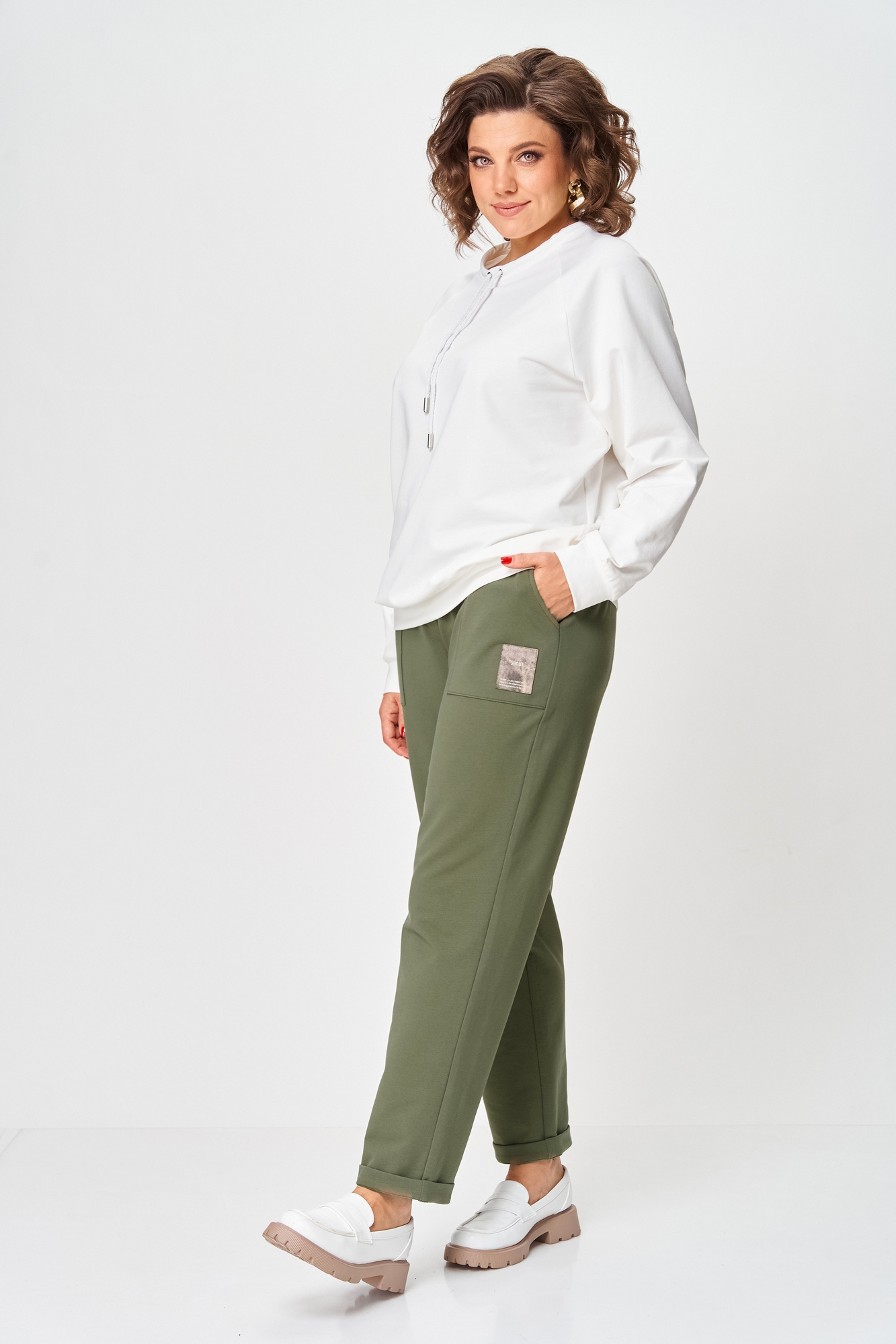 Брюки женские из трикотажной ткани (двунитка), слегка заужены к низу. По переду брюк расположены накладные карманы. На левом кармане настрочной декоративный элемент. В пояс вставлена резинка по кругу.