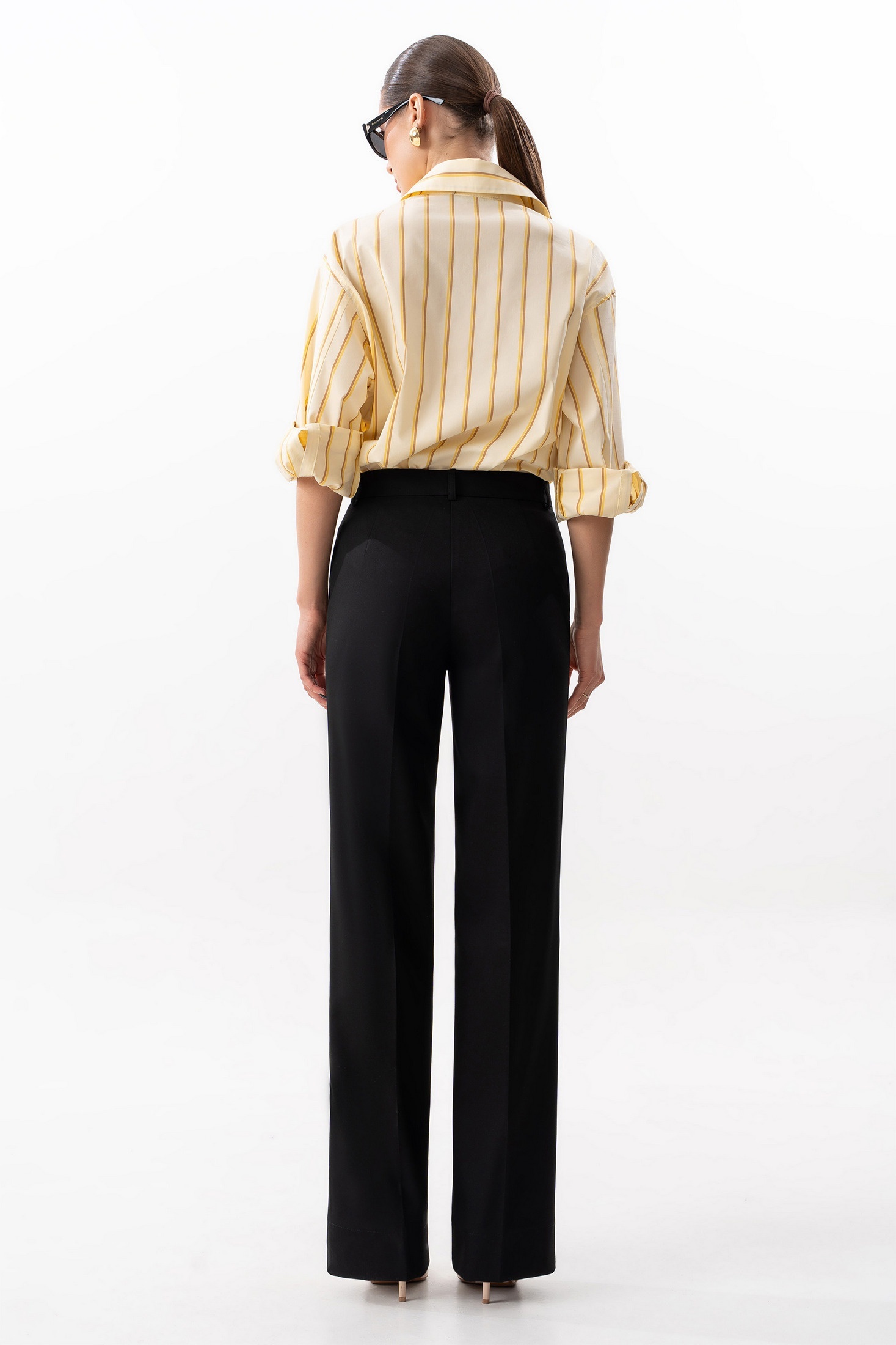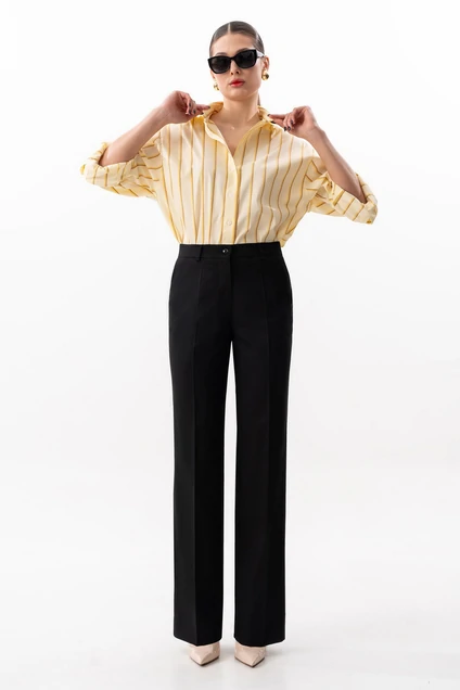 Брюки прямого силуэта, с заутюженными стрелками. Пояс брюк стабильный, по поясу нашиты шлевки. По переду боковые наклонные карманы. Застежка-гульфик с молнией и пуговицей на поясе. Длина брюк по боковому шву с поясом 105 см.