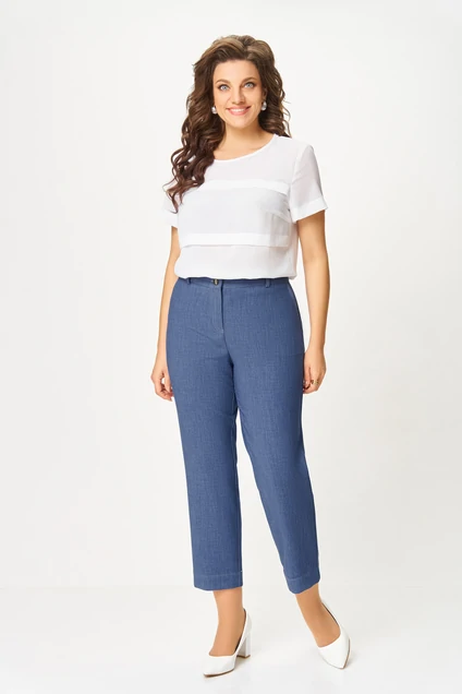 Брюки из мягкой эластичной ткани под джинс, прямого силуэта, заужены к низу. Спереди боковые функциональные карманы, сзади накладные фигурные карманы с двойной контрастной отстрочкой. Пояс притачной с эластичной тесьмой-резинкой по спинке и шлёвками для пояса. Застёжка на тесьму-молнию, петлю и джинсовую пуговицу на поясе.