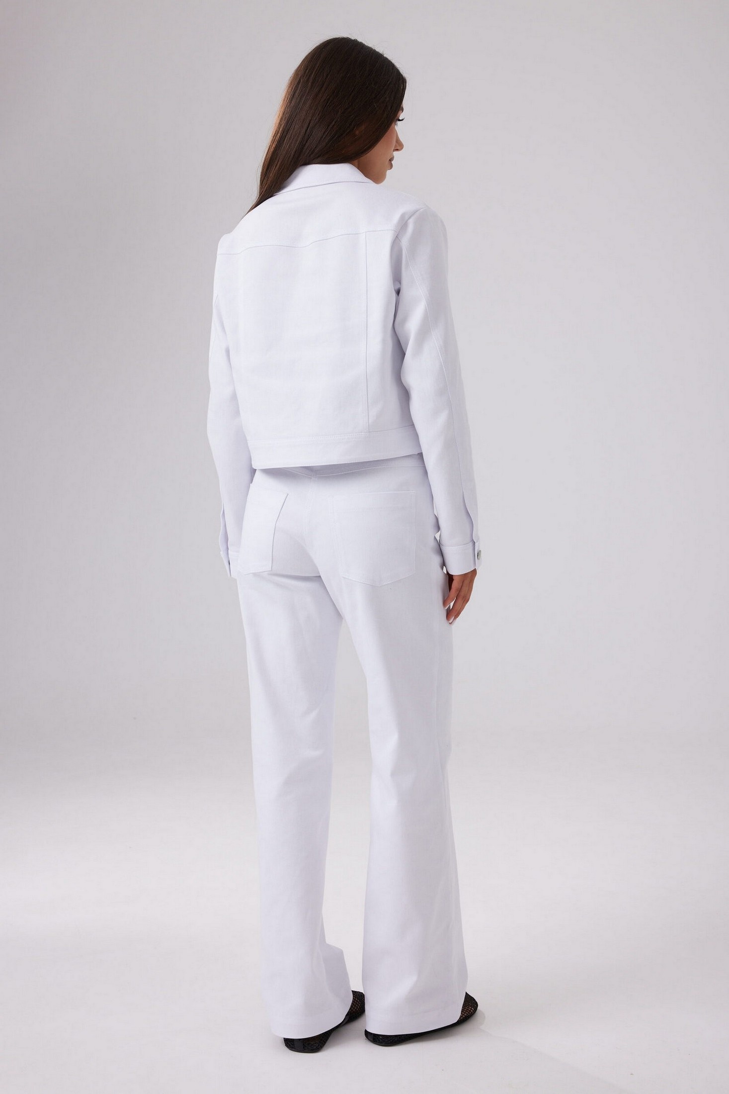 Брюки прямого силуэта, со средней посадкой. По переду в боковых подрезах функциональные карманы. Пояс притачной, с застежкой на металлическую пуговицу и петлю. Застежка на молнию в гульфике. По спинке отрезная кокетка и накладные функциональные карманы. Длина изделия по боковому шву 115 см. Брюки составят стильный образ с жакетом (джинсовкой) М654.