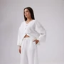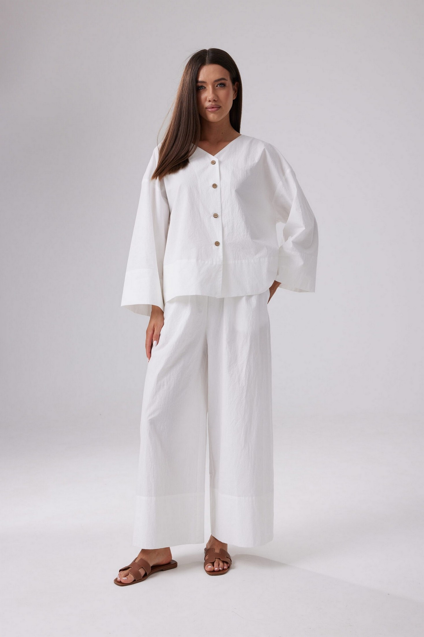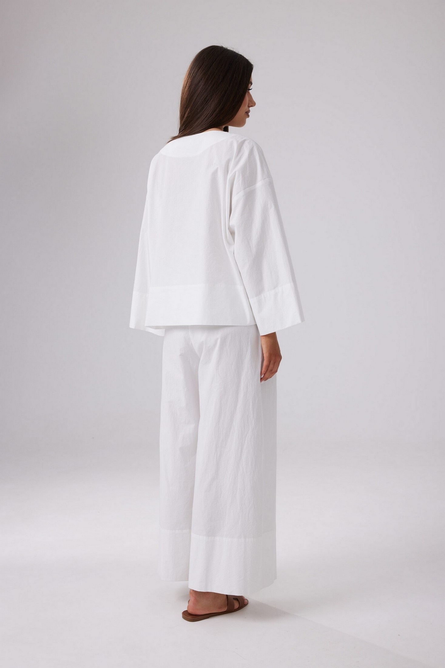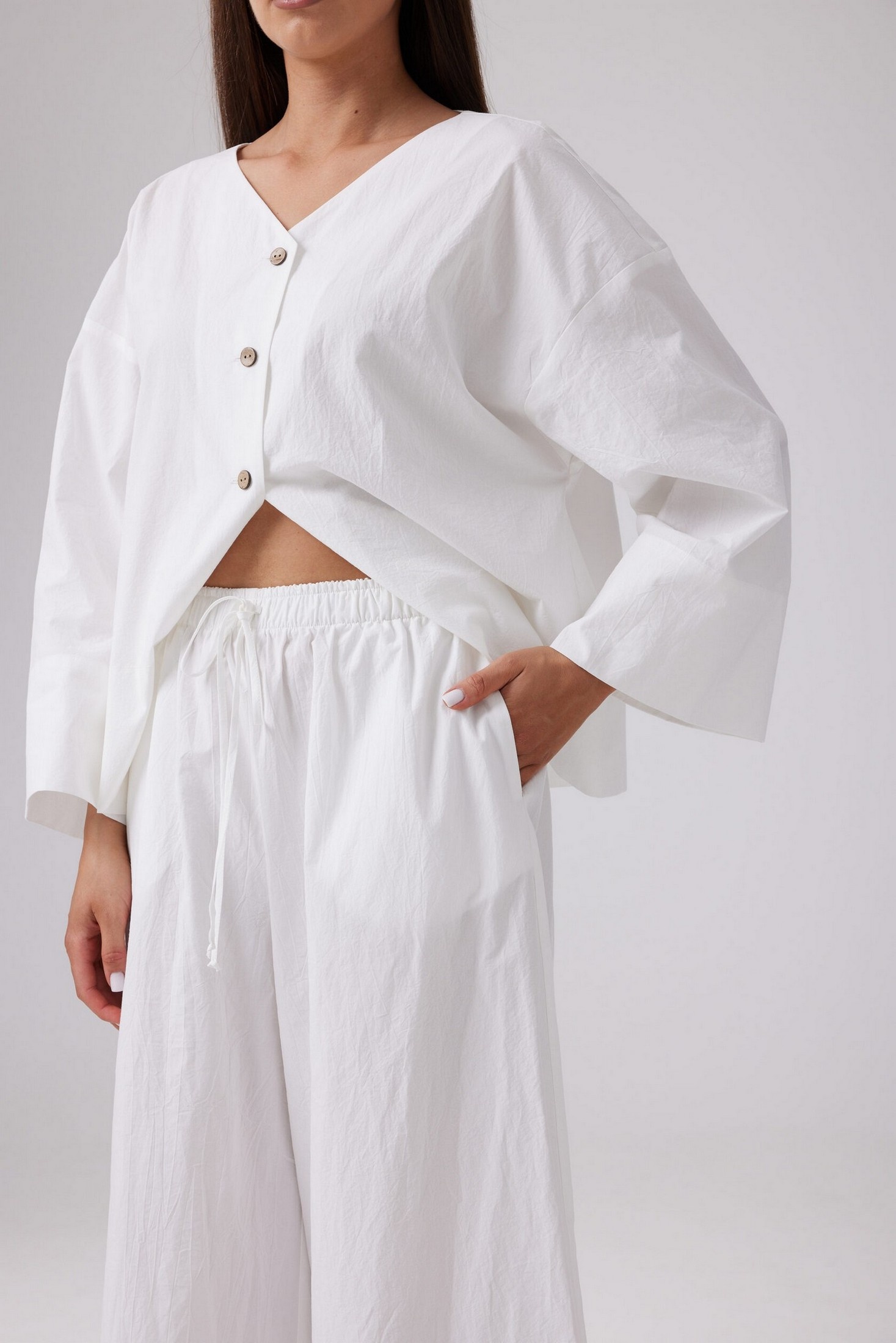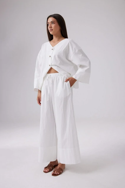 Легкие летние брюки свободного силуэта из хлопковой ткани с эффектом мятости. Пояс на эластичной резинке шириной 4 см, с продетым декоративным шнурком. По низу широкая подгибка. В боковых швах функциональные карманы.