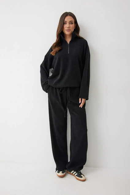 Пояс на резинке обеспечивает идеальную посадку, а дополнительный шнурок из основной ткани позволяет точно отрегулировать объем. Для удобства в боковых швах сделаны функциональные карманы. По низу штанин продета резинка с фиксатором. Вы можете носить брюки классическим прямым кроем или, утянув фиксаторы, создать модный силуэт джоггеров, который подчеркнет спортивную обувь. Эти брюки — идеальное сочетание уюта и актуального спорт-шика.