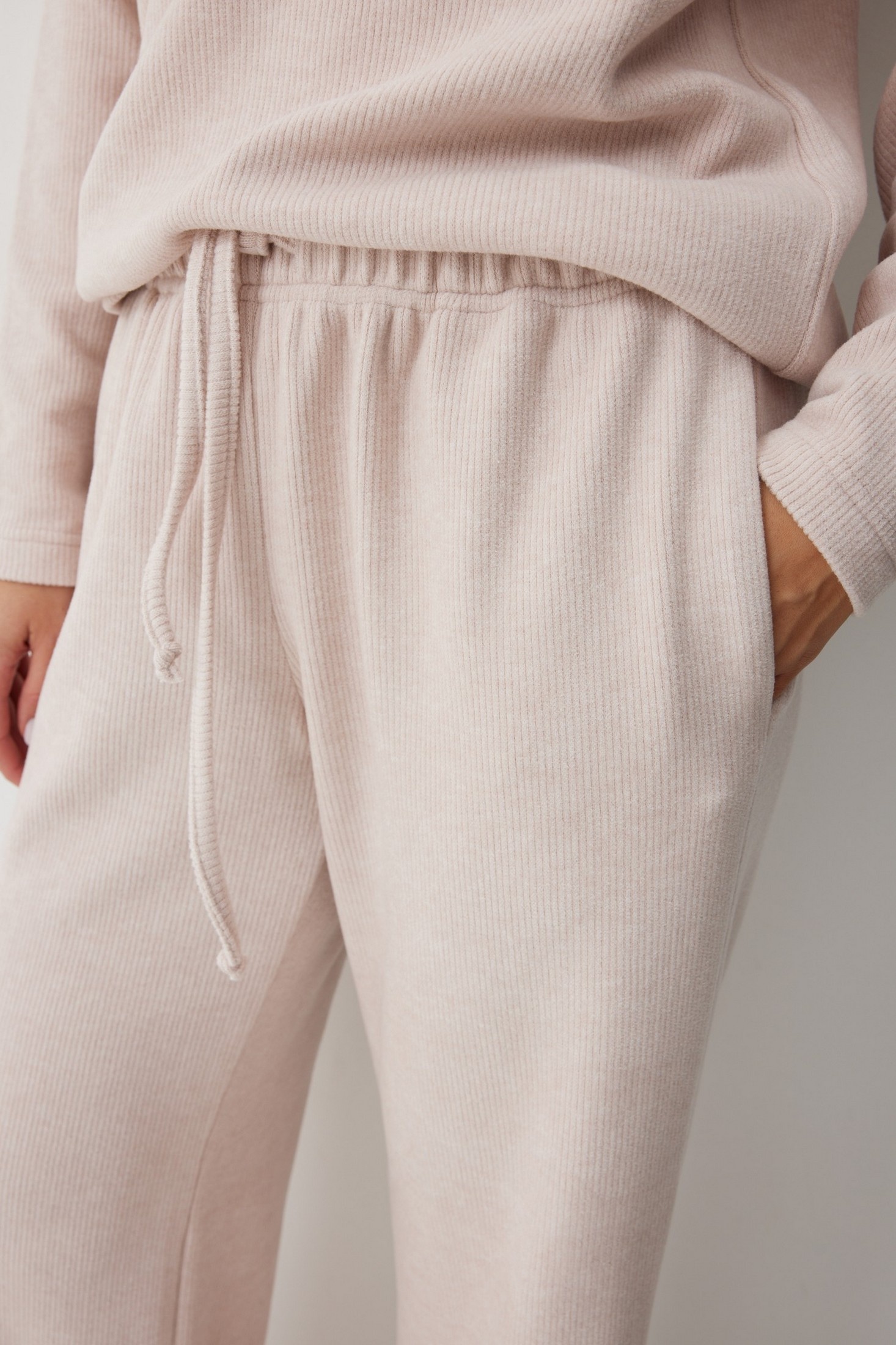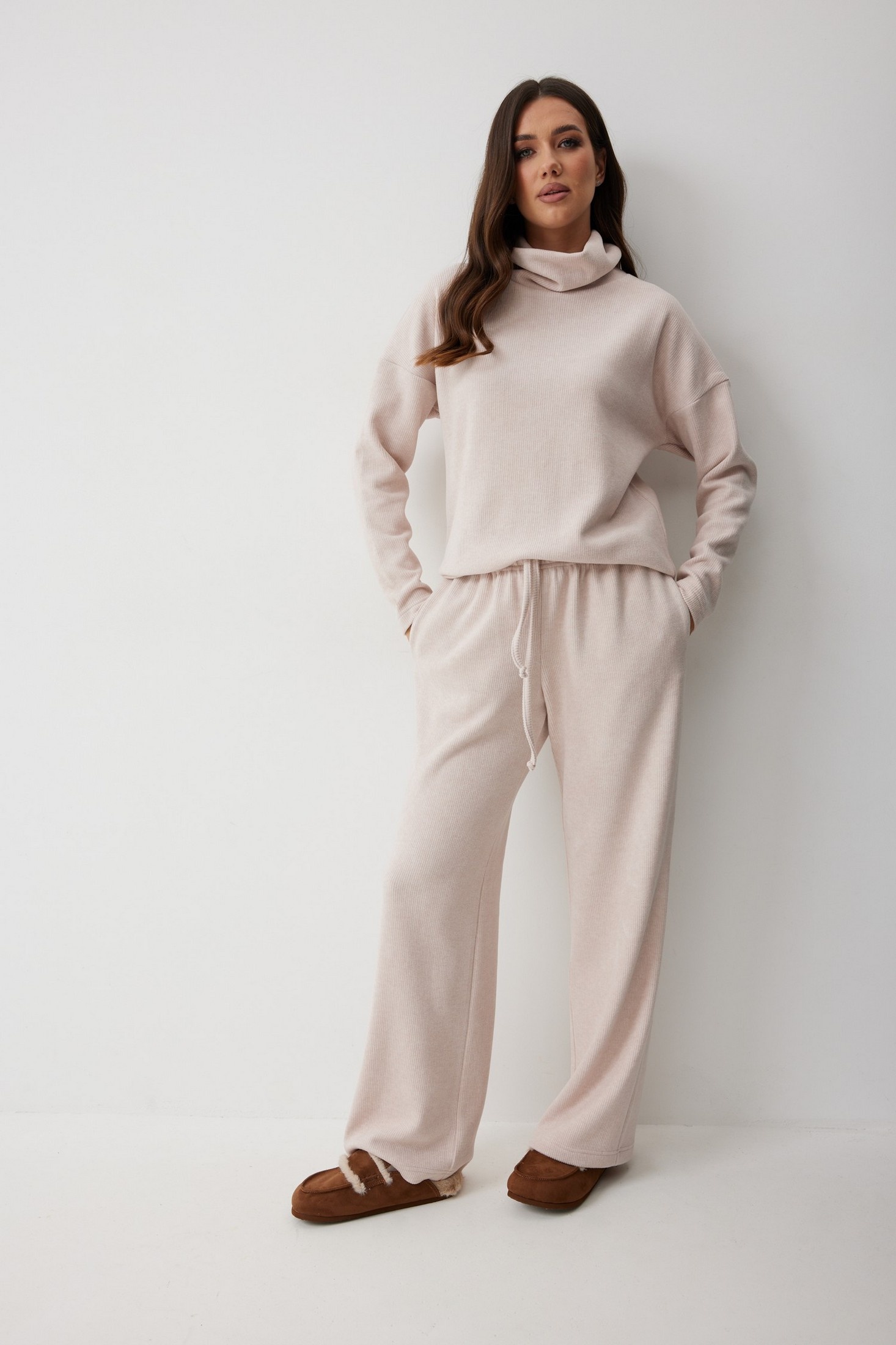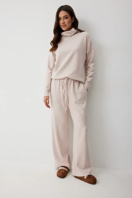 Пояс на резинке обеспечивает идеальную посадку, а дополнительный шнурок из основной ткани позволяет точно отрегулировать объем. Для удобства в боковых швах сделаны функциональные карманы. Эти брюки — идеальное сочетание уюта и актуального спорт-шика.