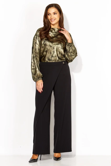 Элегантные черные брюки прямого кроя из высококачественной текстильной ткани, которая обеспечивает комфортное ношение и отлично держит форму. Особенностью дизайна является изящная отлетная деталь по передней части, которая крепится на элегантную отделочную кнопку, добавляя изысканности общему виду. Застежка на брюках выполнена на удобную тесьму "молния" и дополнена петлей с пуговицей для надежной фиксации на талии. Пояс этих брюк отрезной, гладкий спереди и включает эластичную резинку сзади, что обеспечивает оптимальную посадку и комфорт при движении. Такие брюки отлично подойдут как для деловых встреч, так и для более неформальных мероприятий, легко сочетаясь с разнообразными элементами гардероба.
