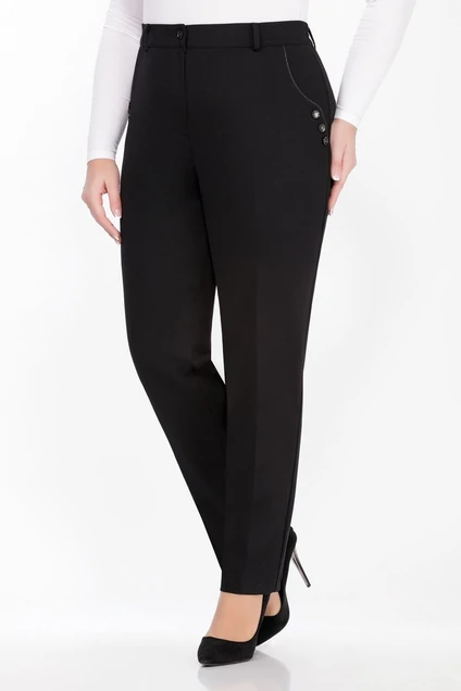 Классические брюки являются одной из самых популярных моделей, так как существуют вне времени моды и сезона, они подчёркивают строгий офисный стиль. Эта модель подойдёт любой женщине за счёт фасона и посадки. Декоративным элементом данной модели являются карманы декорированные кожаным кантом и пуговицами. Длина брюк ок 107 см.