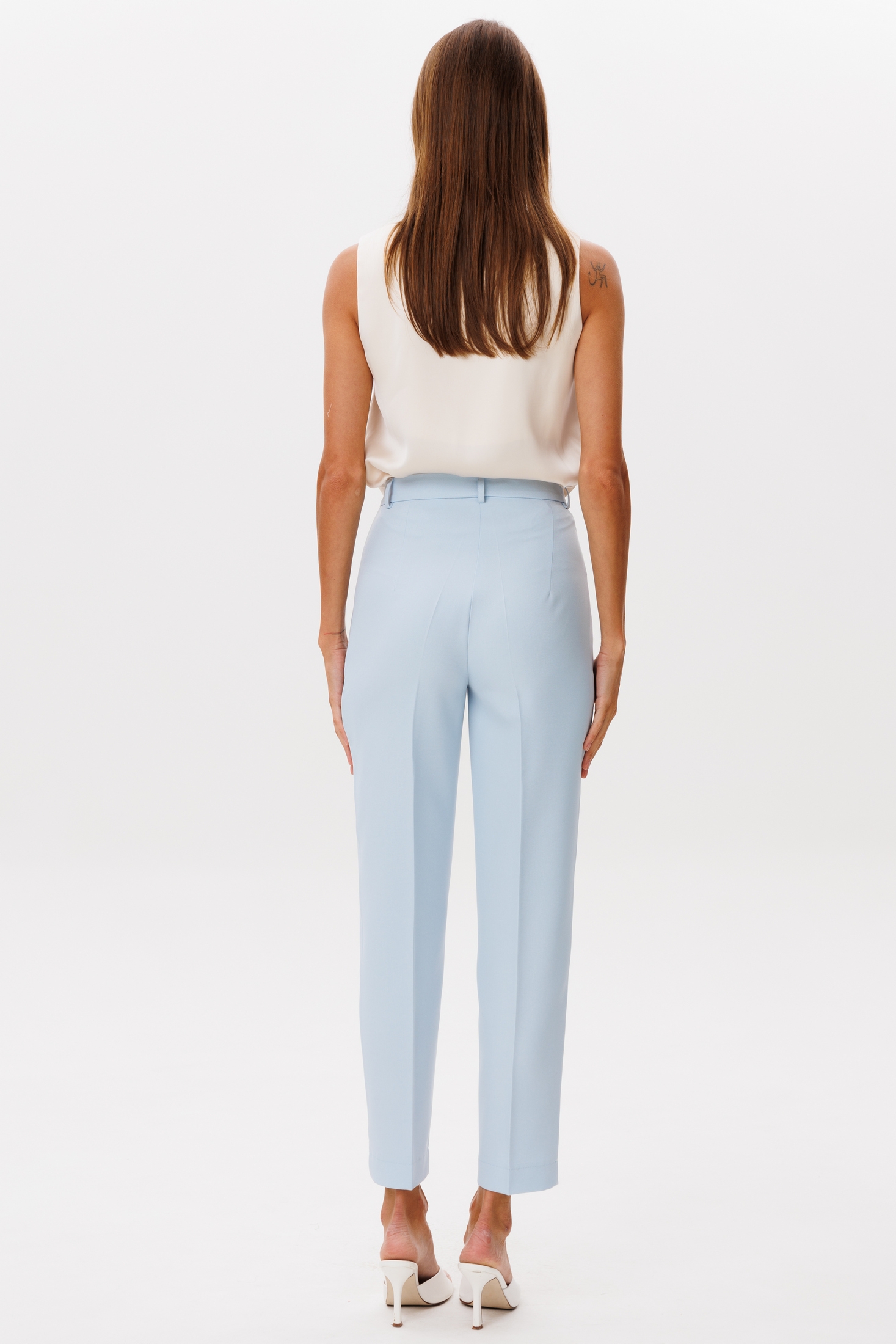Классические укороченные брюки на притачном поясе — идеальный выбор для создания стильного образа. Брюки выполнены в спокойном светло-голубом оттенке, который добавит легкости и воздушности вашему наряду. Застежка на молнию и декоративная петля-пуговица обеспечивают удобство и надежность в использовании. Модель дополнена прорезными карманами в рамку по бокам и высокой посадкой на талии, подчеркивающей фигуру. Эти брюки станут отличным дополнением как к деловым, так и к повседневным образам. Длина по боковому шву составляет 102 см, полуобхват нижней части брючины — 16 см, полуобхват бедер в 44 размере — 46 cm, полуобхват талии — 35 см. Эта универсальная модель отлично подходит на любой тип фигуры, обеспечивая комфорт и уверенность в течение всего дня.