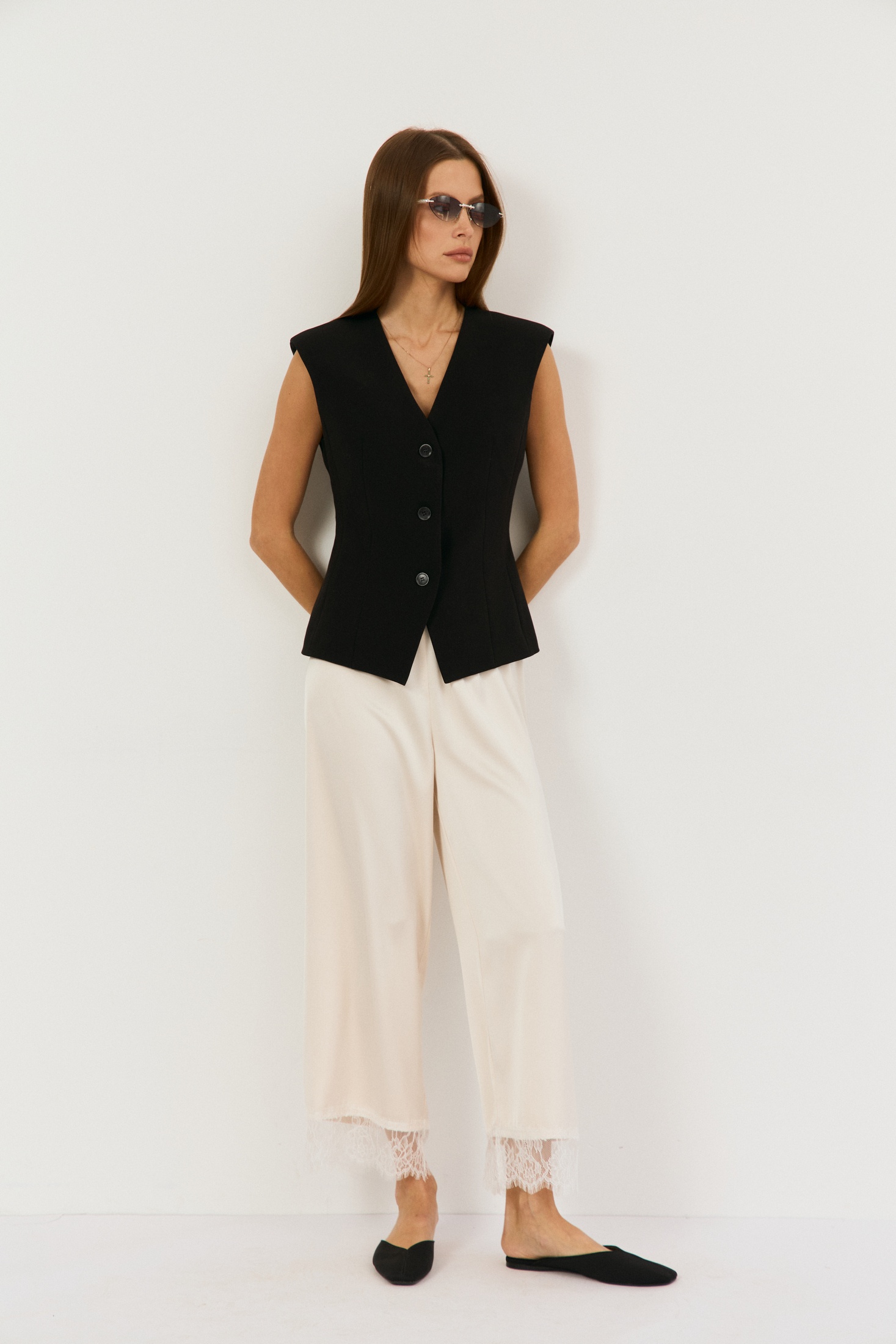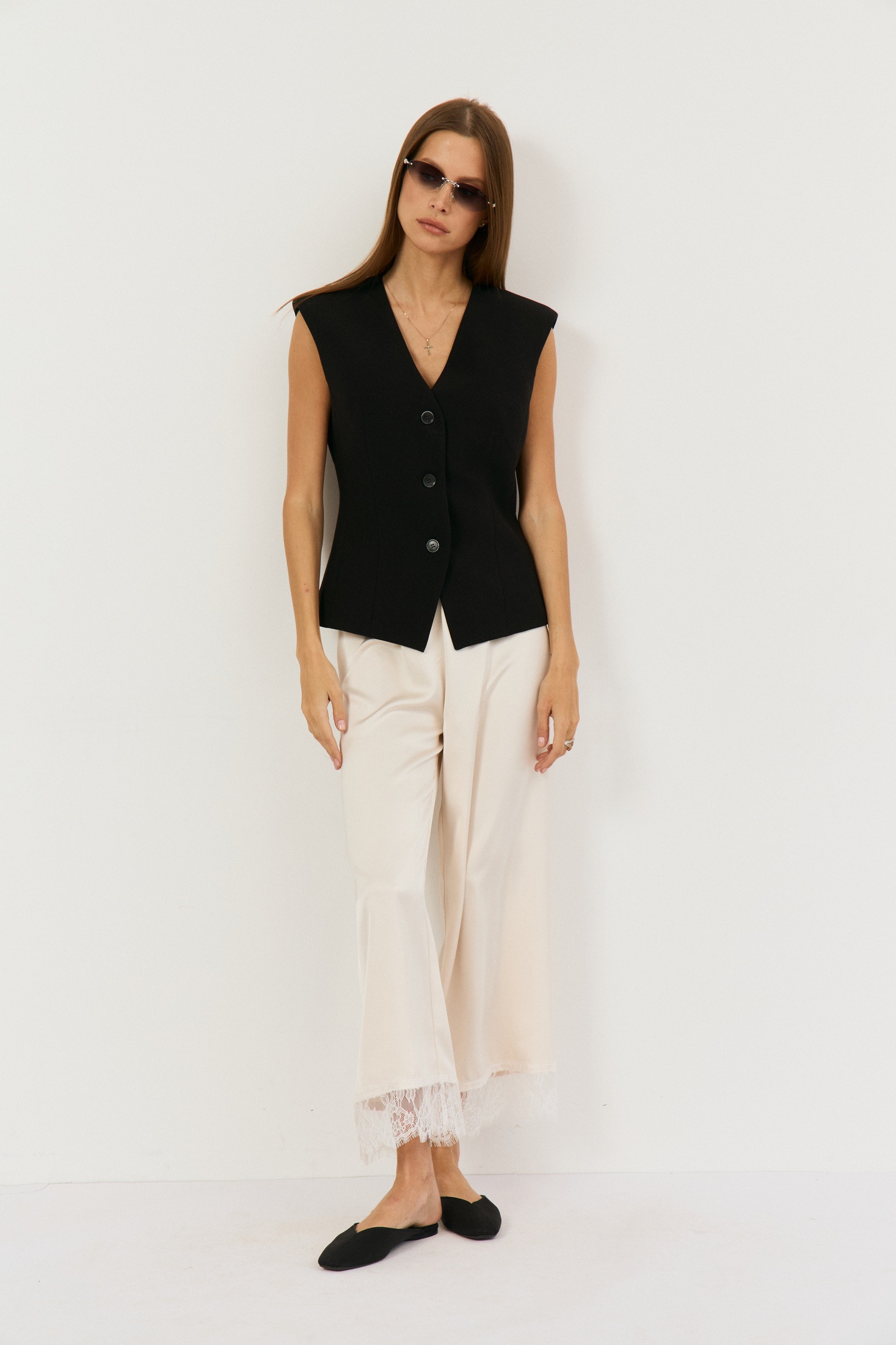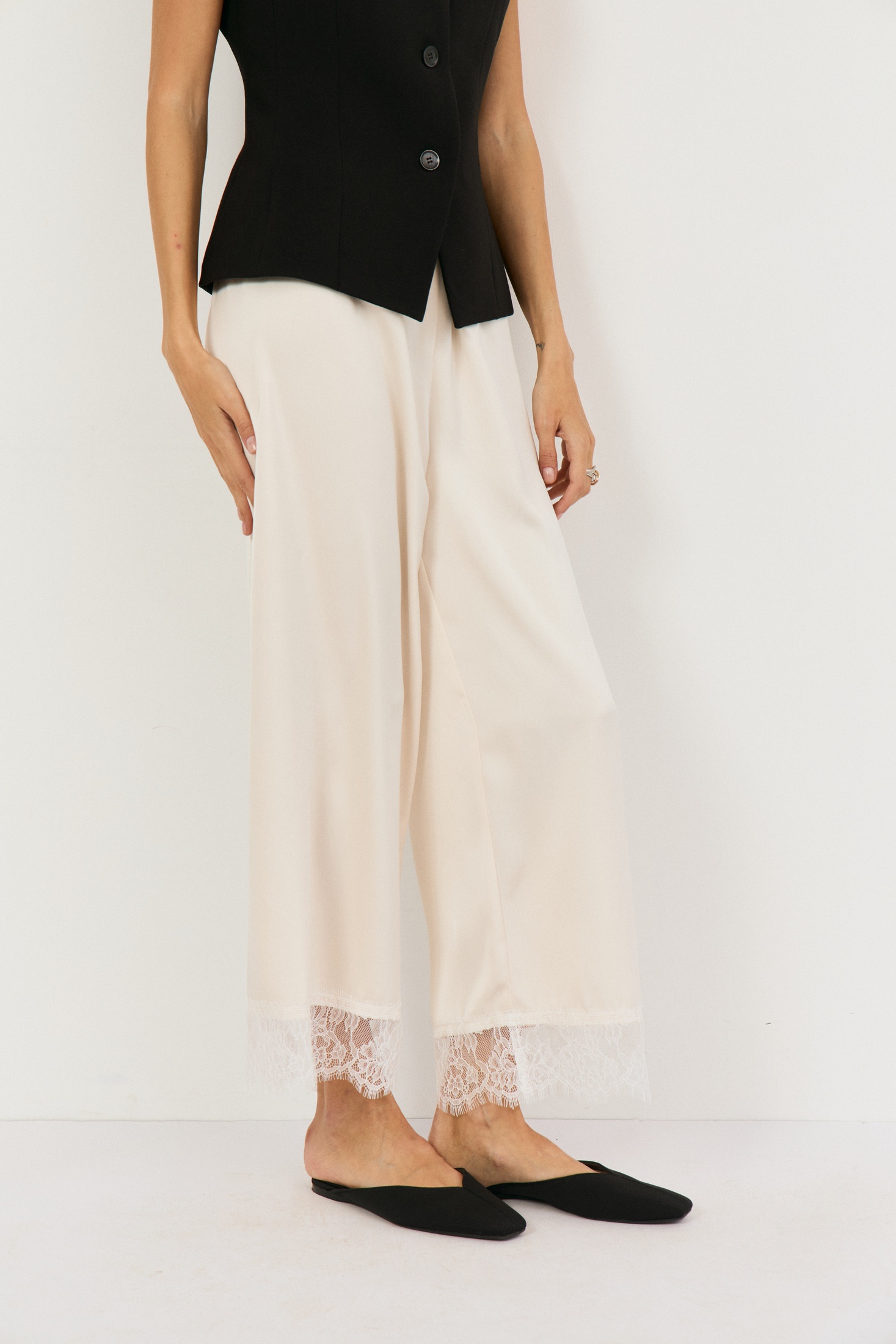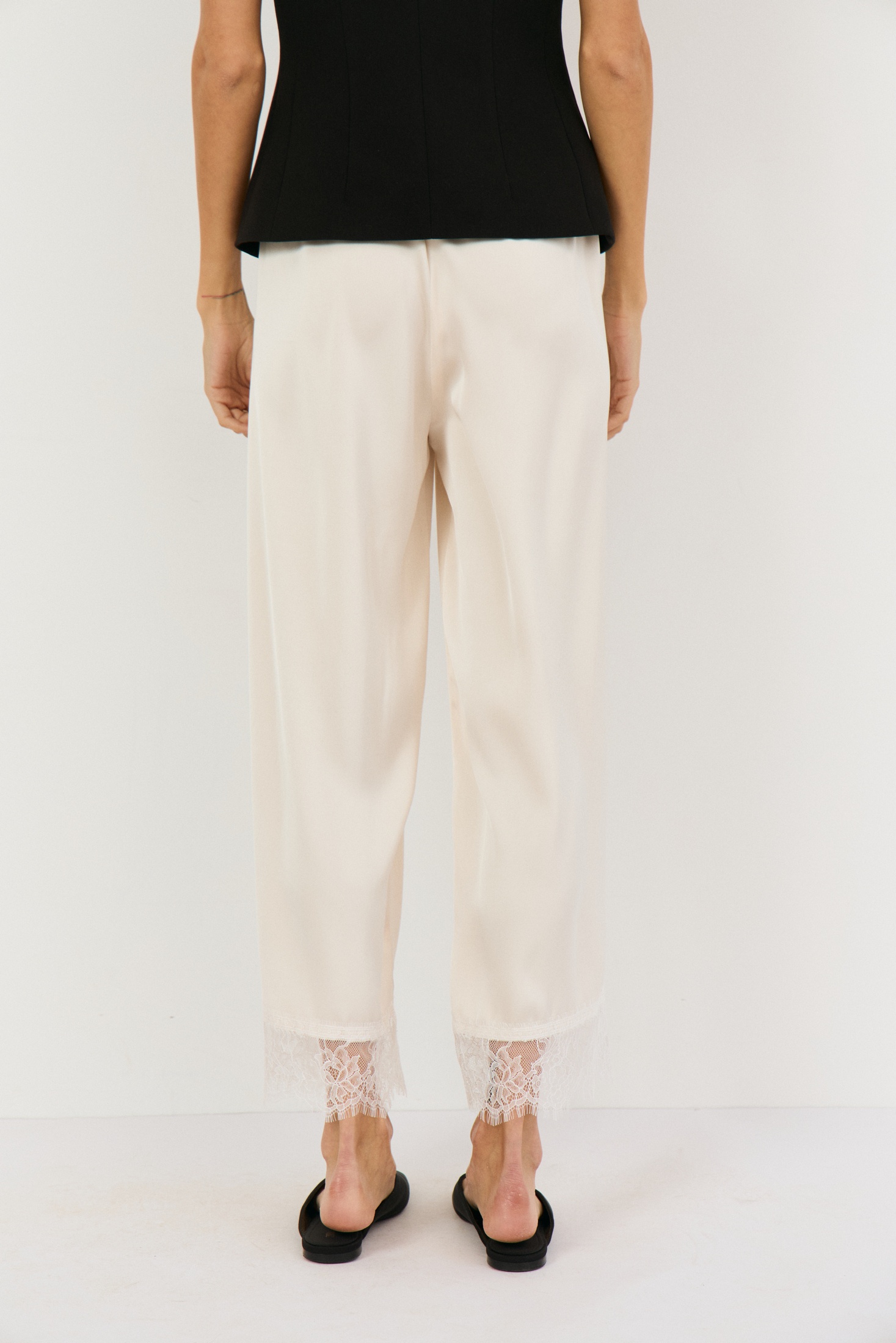 Брюки 2499 сливочный The name — идеальное сочетание стиля и комфорта. Коллекция бренда The name предлагает прямые, укороченные брюки свободного кроя, выполненные из плотной атласной ткани. Благодаря резинке на талии, они обеспечивают удобную посадку. Особенности их дизайна — французское кружево, отстроченное по низу, придающее изысканность. Эти брюки идеально подойдут для весенне-летнего сезона, их сливочный цвет прекрасно сочетается с различными элементами гардероба. Длина по боковому шву составляет 90 см, что делает их подходящими как для повседневных образов, так и для особых случаев.