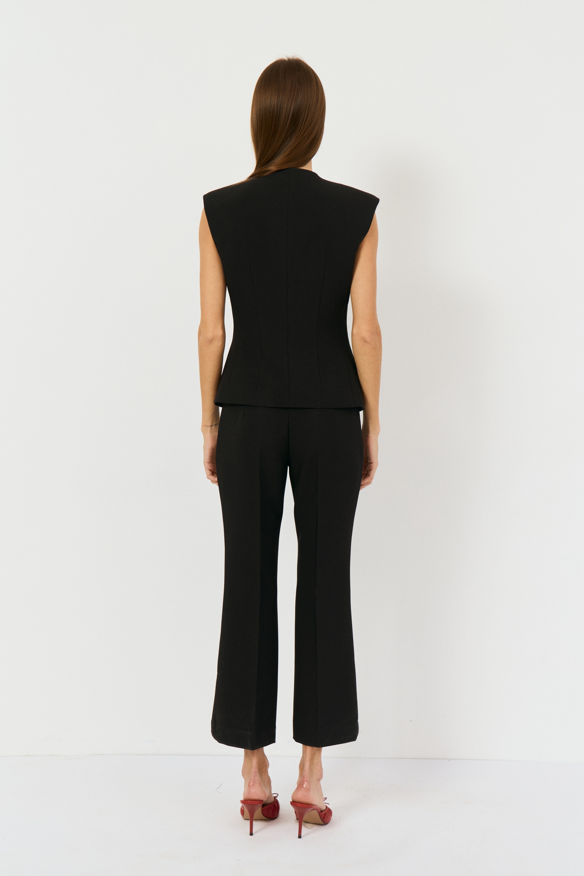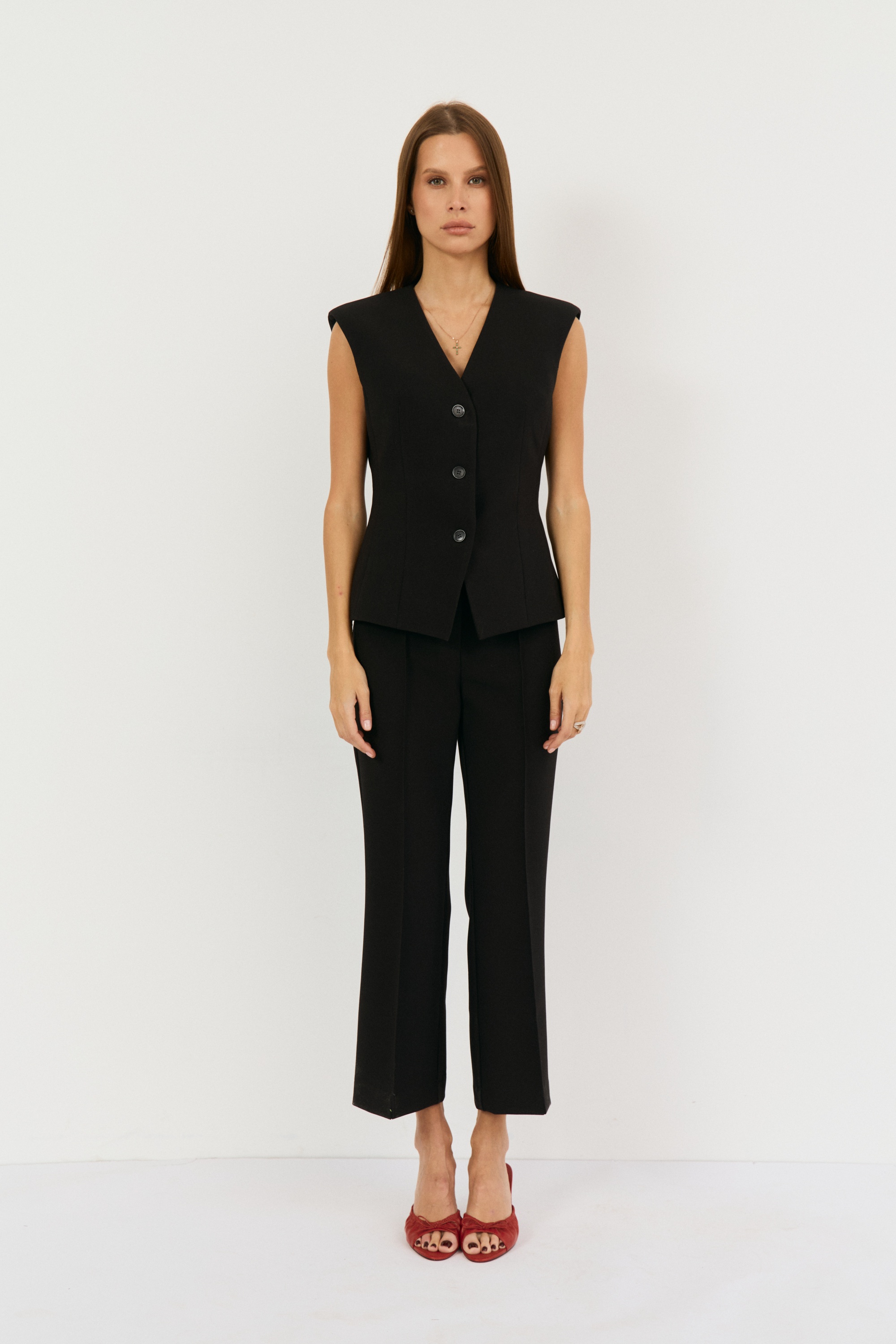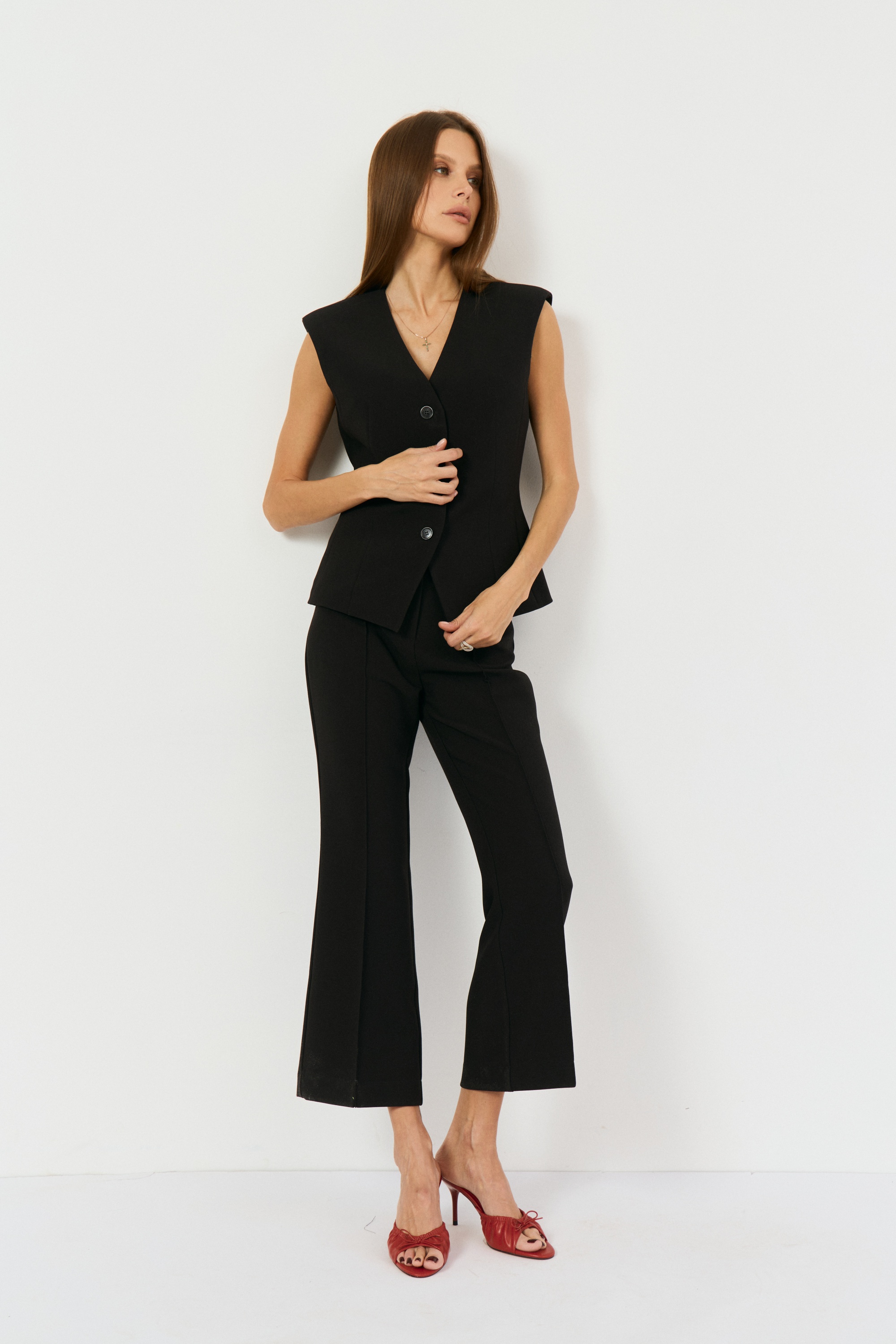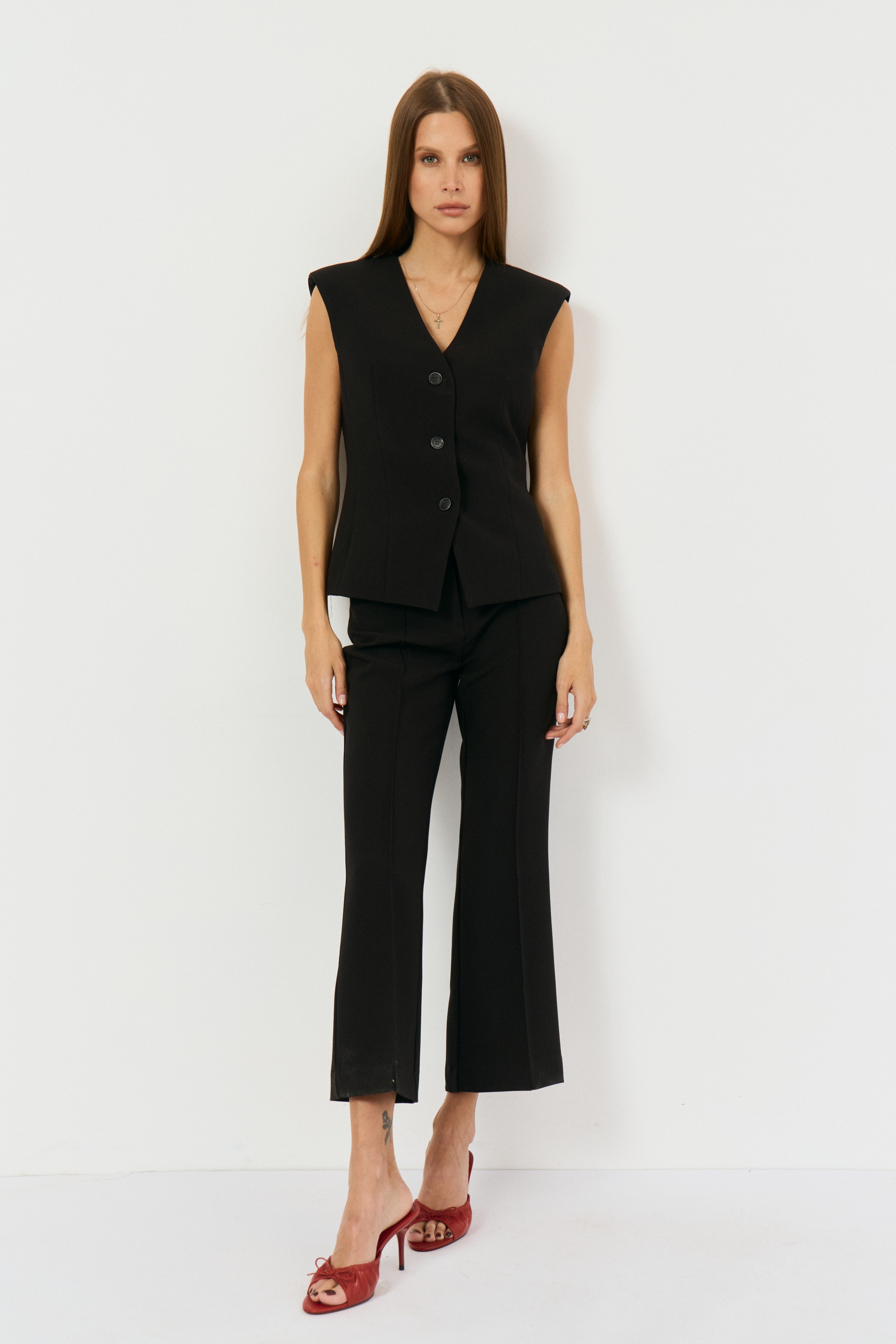 Брюки 2506 черный The name — это стильное решение для вашего гардероба. Коллекция бренда The name предлагает укороченные брюки из костюмной ткани, благодаря которой они сохраняют форму и обеспечивают комфорт. Прилегающий силуэт с легким расклешением к низу делает эти брюки идеальными для офисного образа. Застежка-муляж на молнию и пуговицу добавляет удобства, а отсутствие карманов подчеркивает минимализм дизайна. Черный цвет позволяет легко сочетать брюки с любыми верхами, создавая элегантные и сдержанные образы. Подходят для весенне-летнего сезона, благодаря легкости и воздушности материала. Длина по боковому шву составляет 94 см, а по внутреннему шву — 64 см, что делает их особенно удобными в носке.