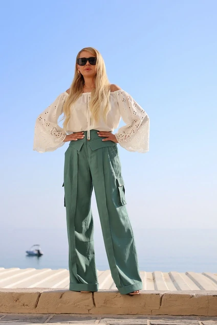 Брюки широкие из вискозной ткани. Верх брюк с декоративным отложным элементом. Застёжка по центру переда на молнию. Боковые наклонные карманы. По переду складки. Накладные карманы-портфели. Низ брюк на манжете.