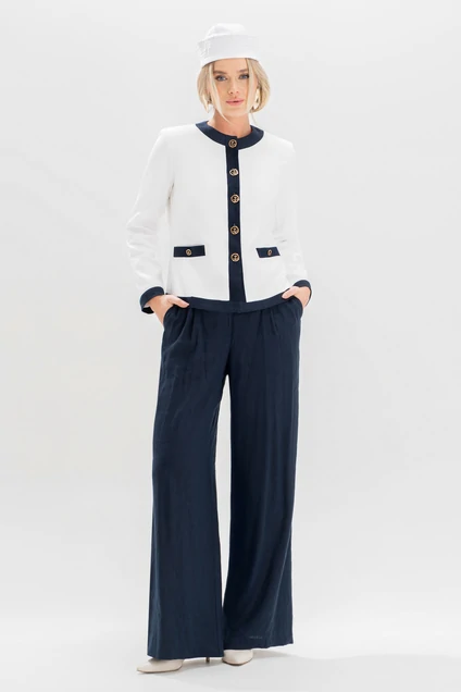 Брюки женские, выполнены из костюмно-плательной ткани лен, для повседневной носки. В размерах 44,46,48,50 прямые от бедра, на обтачном поясе, с 5-ю шлевками, с застежкой на тесьму - «молнию», расположенную в среднем шве передних половинок. Пояс застегивается спереди на 1 пришивной потайной крючок, 1 петлю и 1 потайную пуговицу (размер и цвет фурнитуры может незначительно отличаться от фото). Передние половинки брюк, с односторонними складками, с боковыми наклонными карманами. Складки и карманы частично застрочены от пояса вниз. Задние половинки брюк с двумя парами талиевых вытачек. Брюки без заутюженных стрелок.