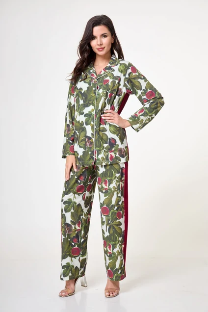 Классическая пижама с бархатными лампасами по боковым швам и актуальным принтом. Предназначена не только для дома, но и для смелых модниц для повседневной носки. В ней вам будет невероятно комфортно, как на работе, так и во время прогулки /свидания. Верх длиной до бедра, с классическим воротником, по краю декорирован кантом, застежка на петли пуговицы. На левой половинке переда нагрудный карман. Рукав длинный.