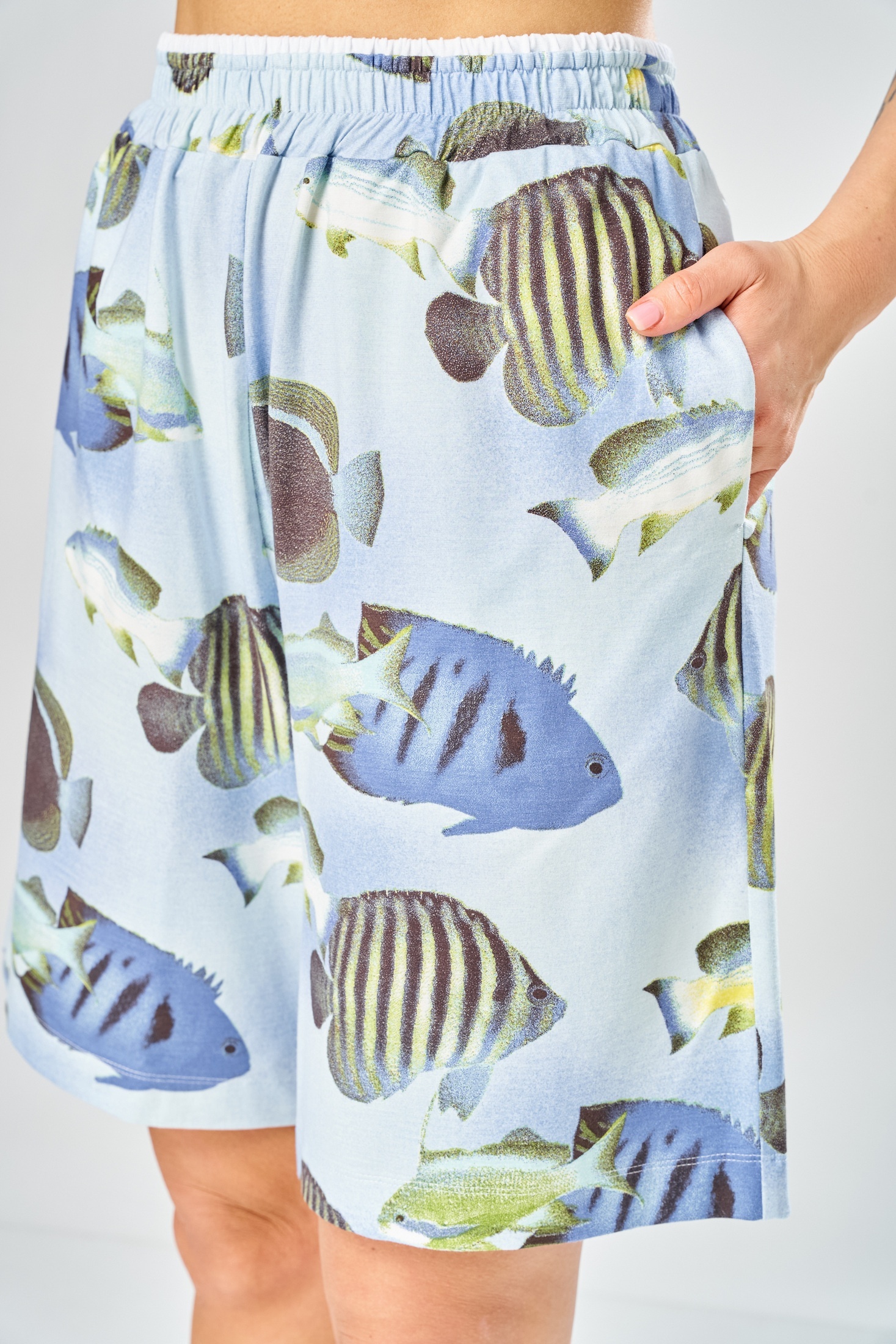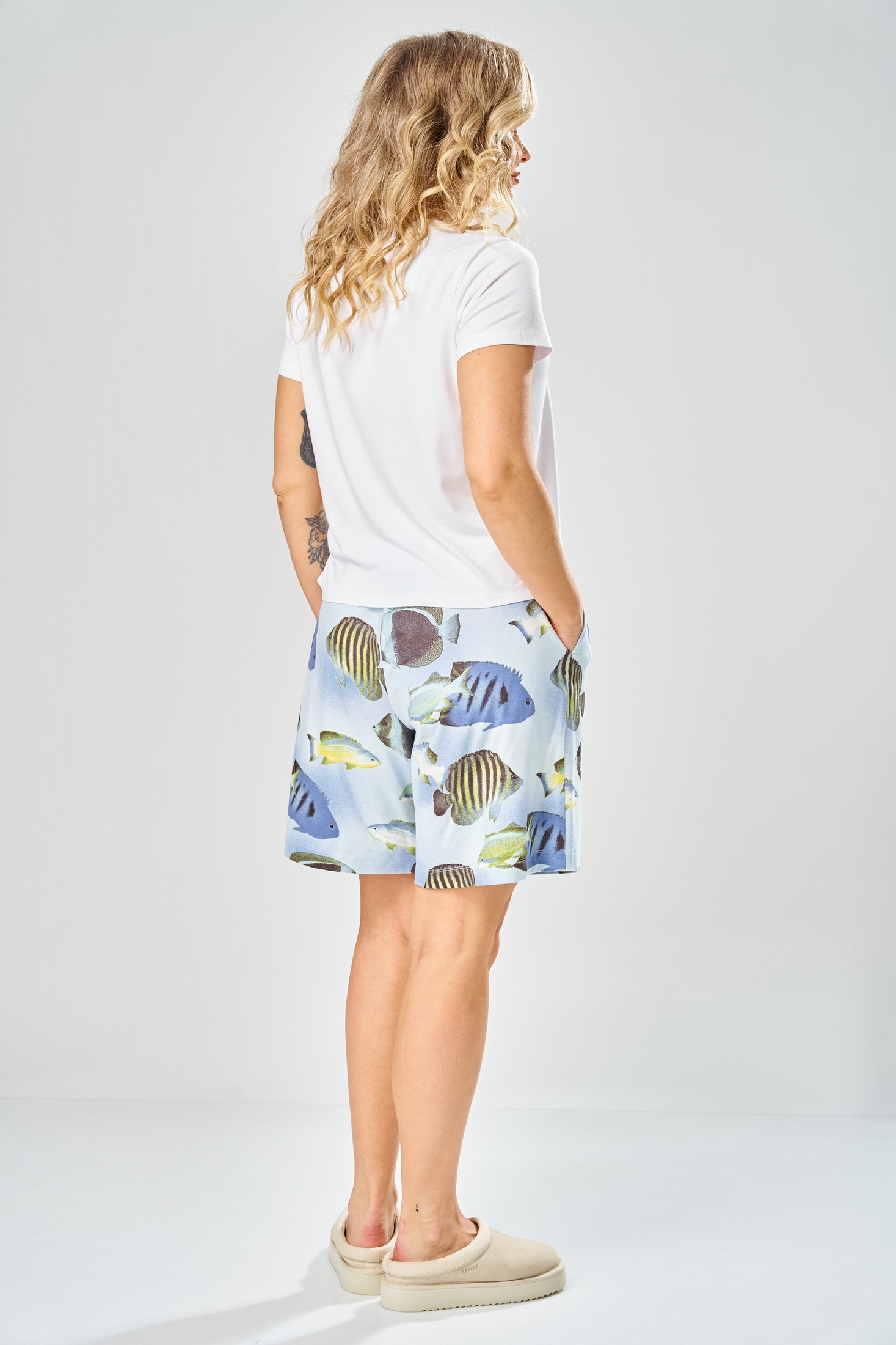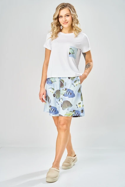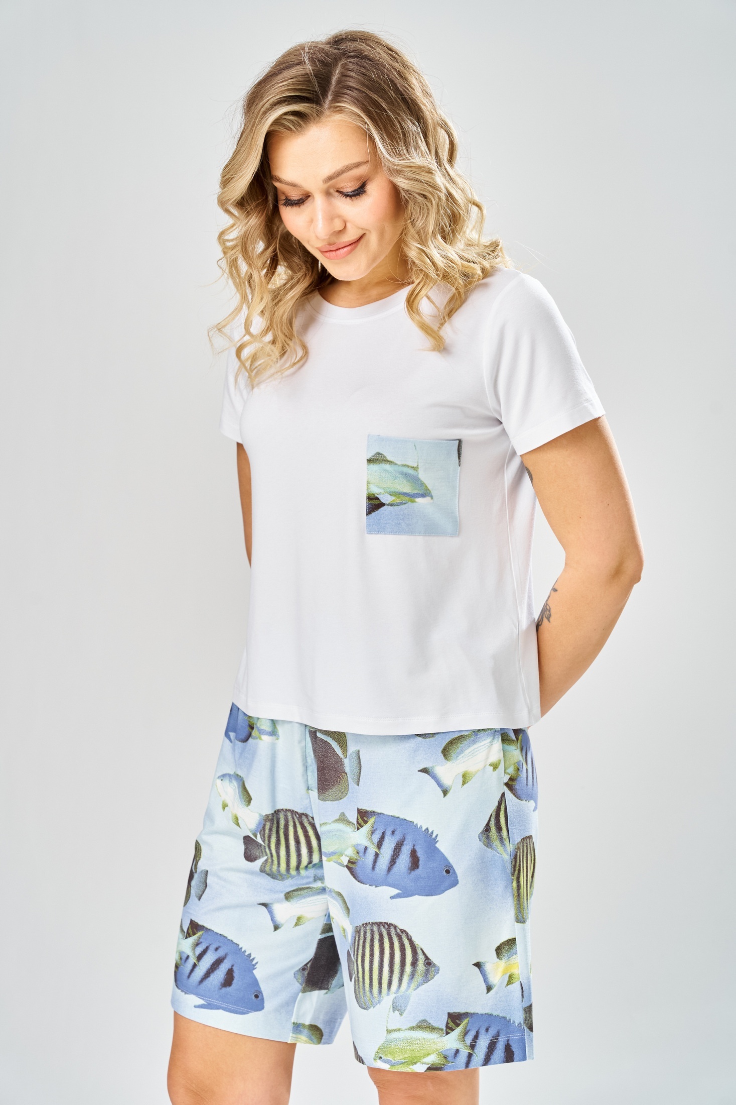 Домашний костюм с шортами, выполненный из 100% вискозы. В комплекте однотонный белый топ с короткими рукавами и нагрудным карманом, декорированным ярким рыбьим принтом. Свободные шорты на мягкой резинке украшены крупным принтом в виде разноцветных морских рыб на светлом фоне. Отличный выбор для дома и сна.
