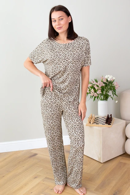 Очаровательный домашний брючный костюм, выполненный из мягкого и приятного к телу кулирного полотна, представляет идеальное сочетание комфорта и стиля. Комплект включает в себя футболку с короткими рукавами и штаны прямого кроя. Весь костюм оформлен в яркий и модный леопардовый принт в коричневых и бежевых оттенках, что добавляет изюминку в повседневный гардероб. Футболка украшена элегантным вырезом на спине с перекрестными деталями, что придает нотку утонченности и женственности. Этот костюм не только идеален для домашнего отдыха, но и отлично подойдет для быстрых выходов на улицу.
