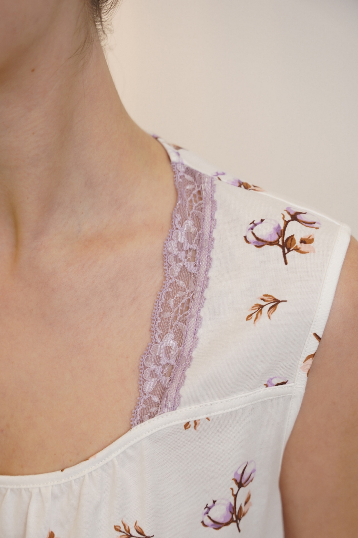 Изящная ночная сорочка в деликатном белом цвете украшена очаровательным принтом в виде небольших бордовых и розовых лошадок, добавляющих игривое настроение. Дизайн дополнен нежными кружевными вставками розового цвета на плечах, создающими легкий и воздушный образ. Модель имеет свободный крой, что обеспечивает комфорт во время сна. Гладкий и приятный на ощупь материал гарантирует отличные ощущения при носке.