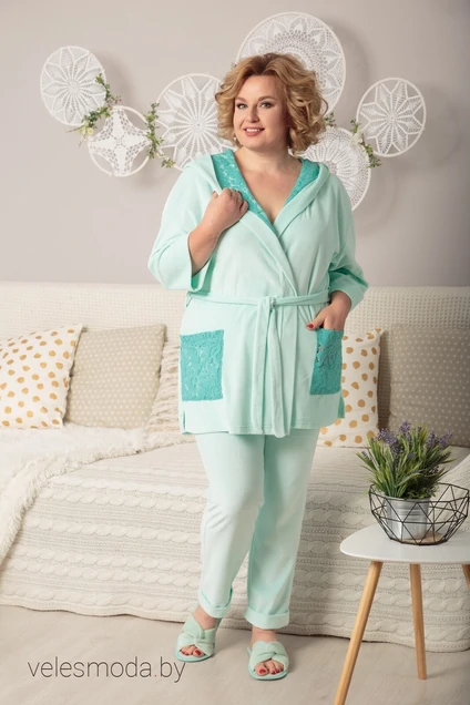 Мягкий и удобный комплект домашний выполнен из велюра нежно-мятного цвета.