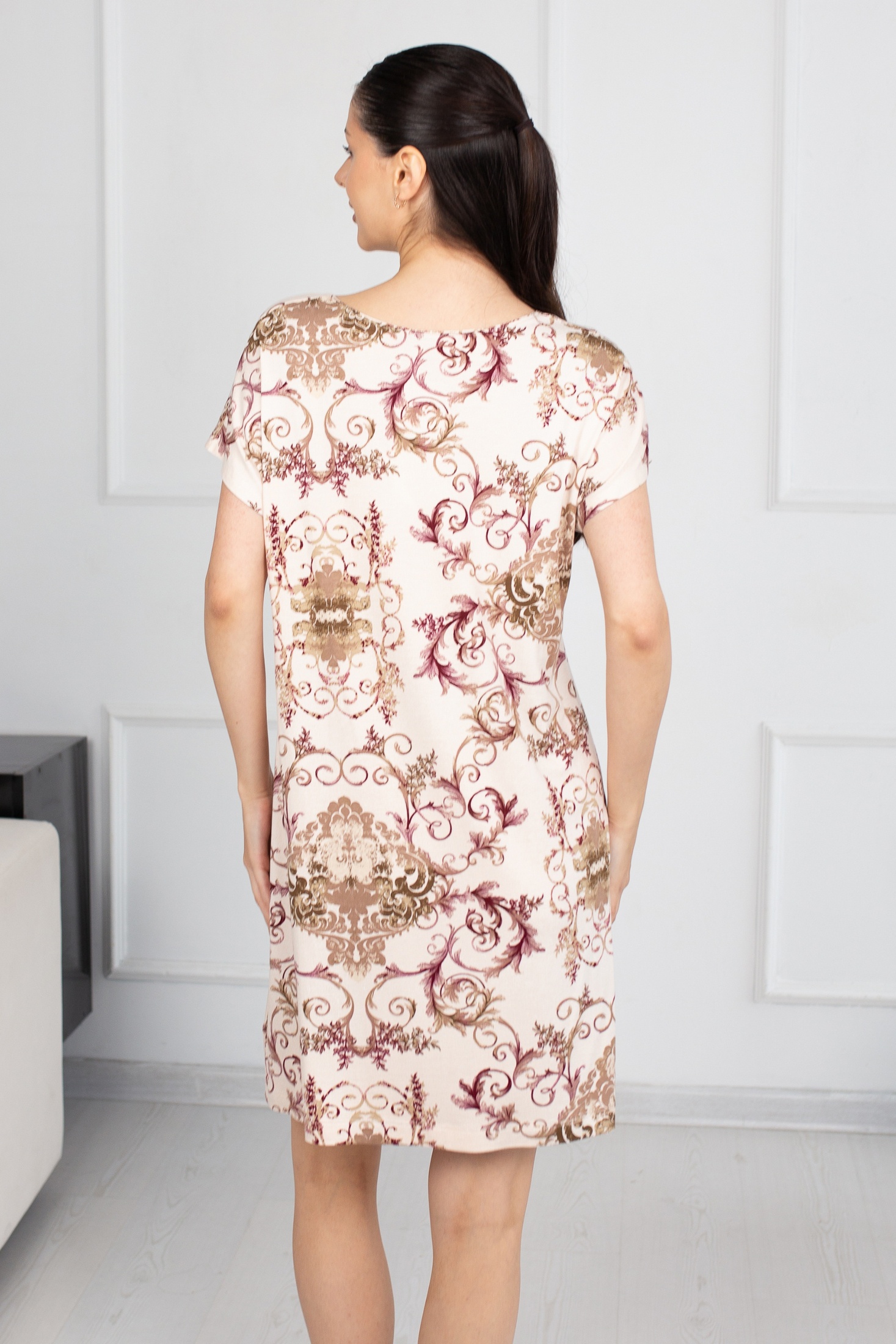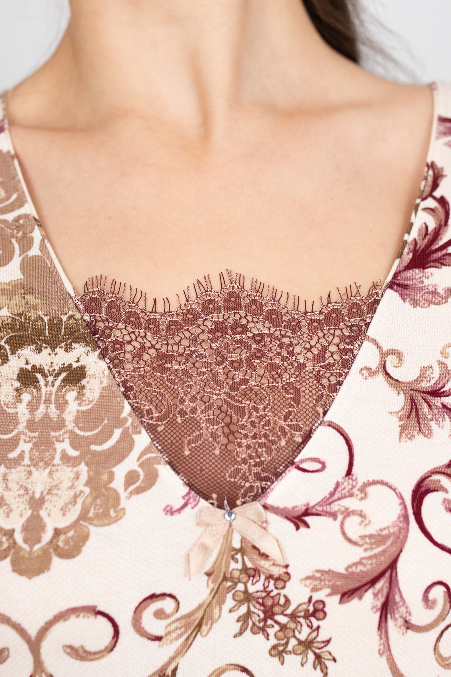 Элегантная ночная сорочка светло-бежевого оттенка украшена изысканным принтом в виде золотистых и бордовых узоров, что придает изделию особенный шарм. Дизайн дополняет кружевная отделка темно-бежевого цвета на груди, добавляя нотку изящества и женственности. Сорочка имеет короткие рукава и прямой силуэт, обеспечивая комфорт во время сна. Эта модель идеально подойдет для тех, кто ценит комфорт и красоту в деталях своего ночного гардероба.