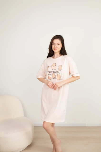 Ночная сорочка нежно-розового цвета с короткими рукавами. Украшена милым принтом с изображением котят и надписью "Cat Lovers" на груди. Свободный прямой крой обеспечивает комфорт и легкость движений. Идеальный выбор для уютных домашних вечеров.