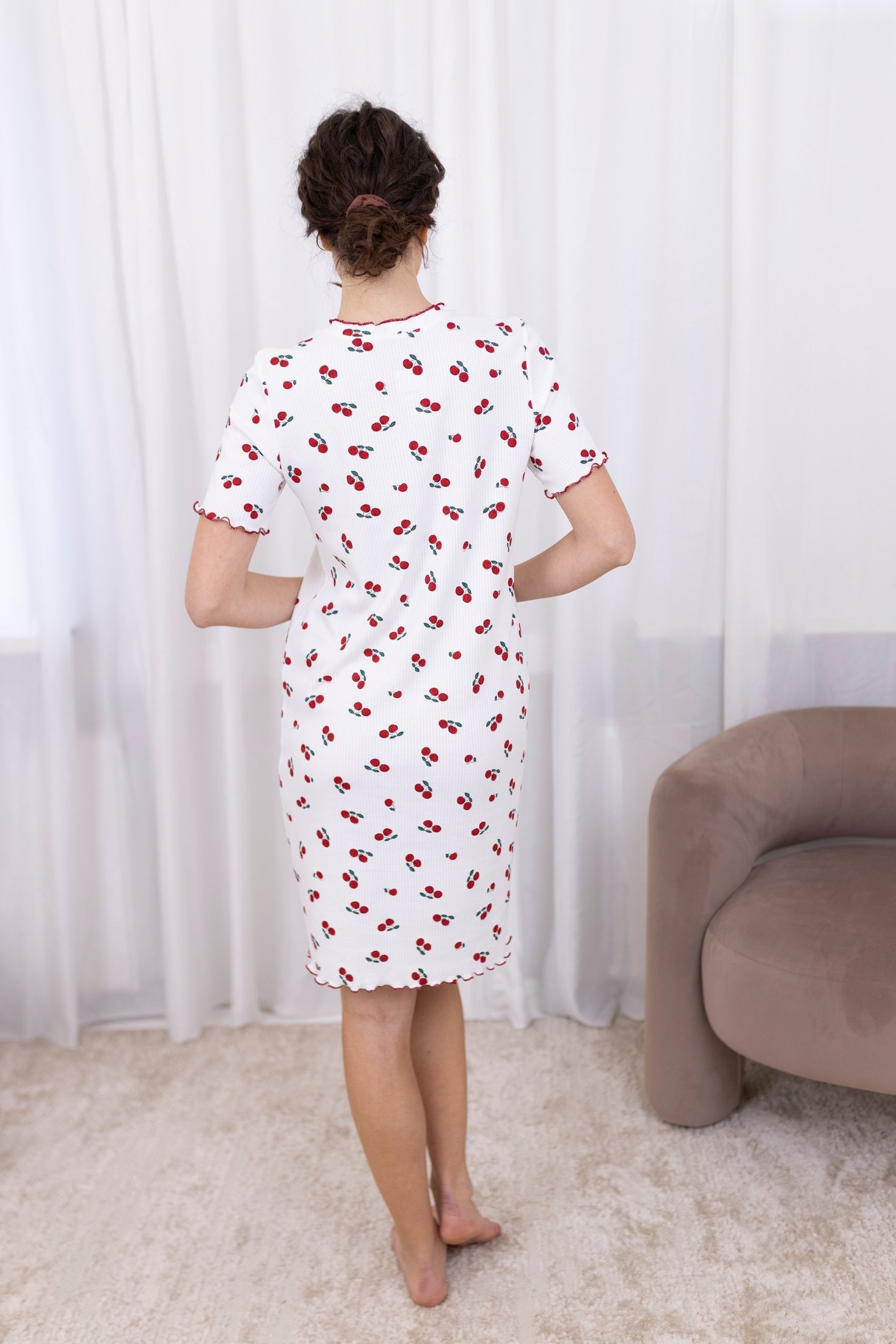 Ночная сорочка выполнена из мягкой ткани белого цвета и украшена ярким принтом в виде красных вишен. Прямой свободный крой обеспечивает комфорт и свободу движений, а длина чуть ниже колена добавляет уюта. Короткие рукава и округлый вырез горловины отделаны красной декоративной строчкой, подчеркивающей акцентные детали изделия. Такая модель прекрасно подойдет для домашнего отдыха и спокойного сна, сочетая в себе лаконичность и выразительный дизайн.