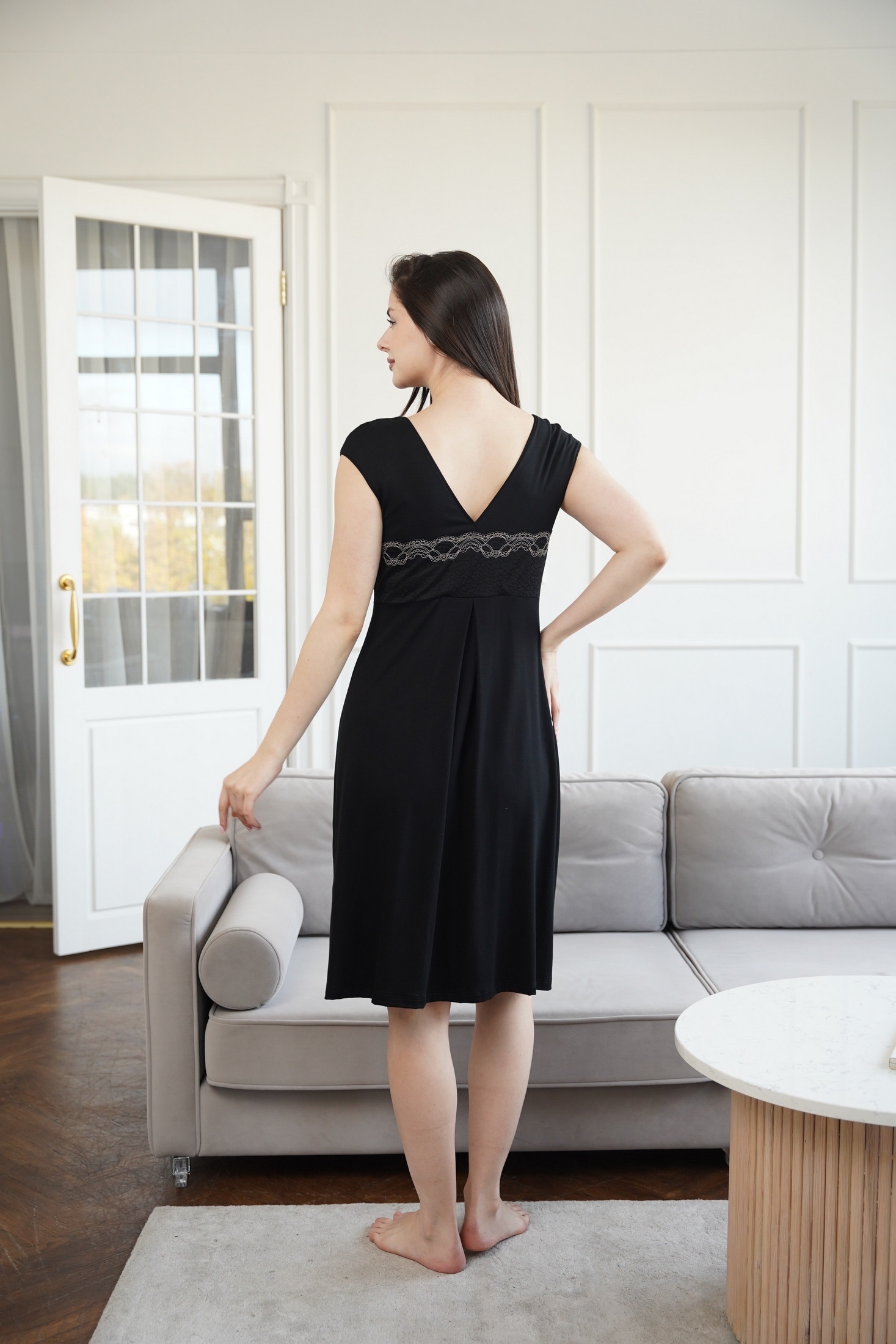 Элегантная черная ночная сорочка из нежного текстиля. Модель средней длины дополнена утонченным кружевным украшением на уровне груди и по спине, создающим изысканный контраст. Бретельки тонкие, дополняют общий минималистичный дизайн. Подчеркнет ваш изысканный вкус и обеспечит комфорт во время отдыха.