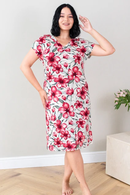 Эта женская ночная сорочка из приятного к телу кулирного полотна представлена в элегантном белом цвете с ярким цветочным принтом красного и розового оттенков. Дизайн с короткими рукавами и классическим круглым вырезом подчеркивает легкость и женственность образа. Сорочка дополнена комфортной длиной до колена, что делает её идеальным выбором для сна и отдыха в теплое время года.